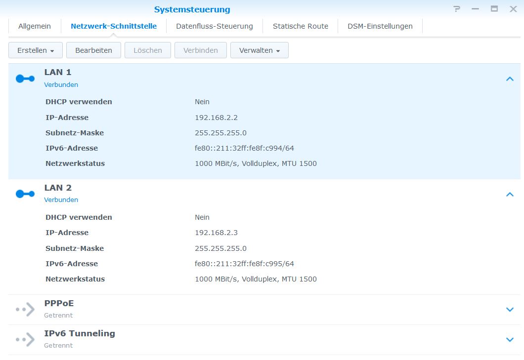 An meiner DS918 nutze ich beide LAN-Schnittstellen, ich habe im NAS die Adressen statisch vergeben.