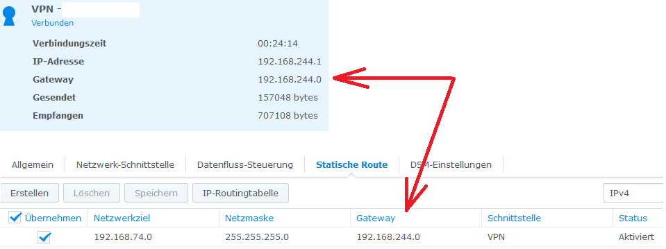 Du kannst mal versuchen (zusätzlich zu den zuvor eingestellten Routen an den Routern, die müssen so bleiben wie ich gescrieben hatte) in der DS 192.168.168.42 die statische Route für 192.168.74.0 255.255.255.0 GW 192.168.244.1 (Tunnel-IP der DS von LAN B) und an der anderen DS 192.168.74.4 entsprechend die Route 192.168.168.0 255.255.255.0 GW 192.168.244.x (Tunnel-IP der DS von LAN A).