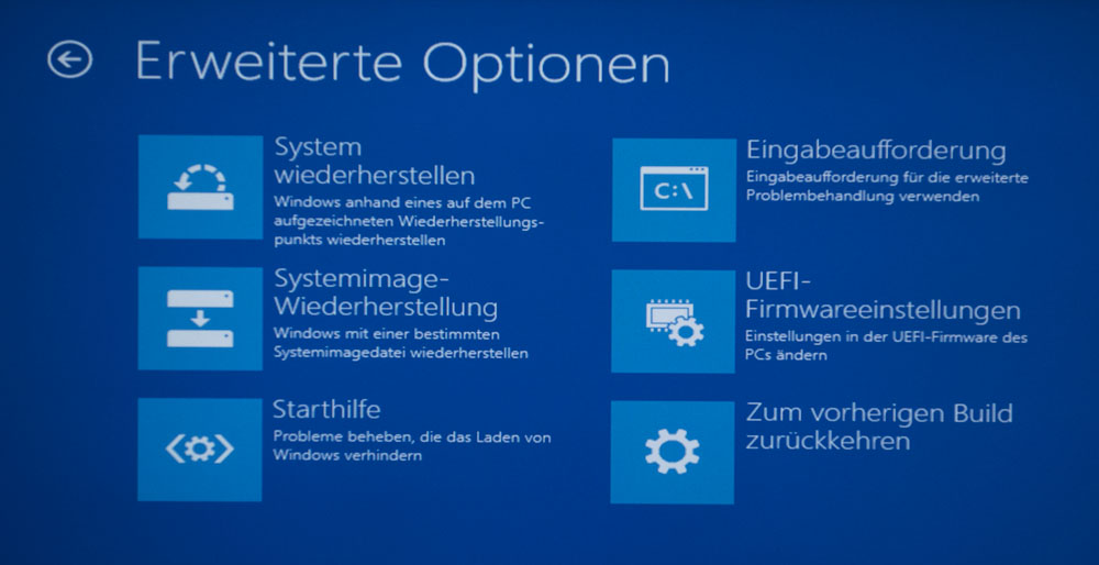bei einem weiteren versuch komme ich wieder in die advanced boot options. "aufgrund eines problems" kann ich auch nicht zum vorherigen builds zurückkehren.
