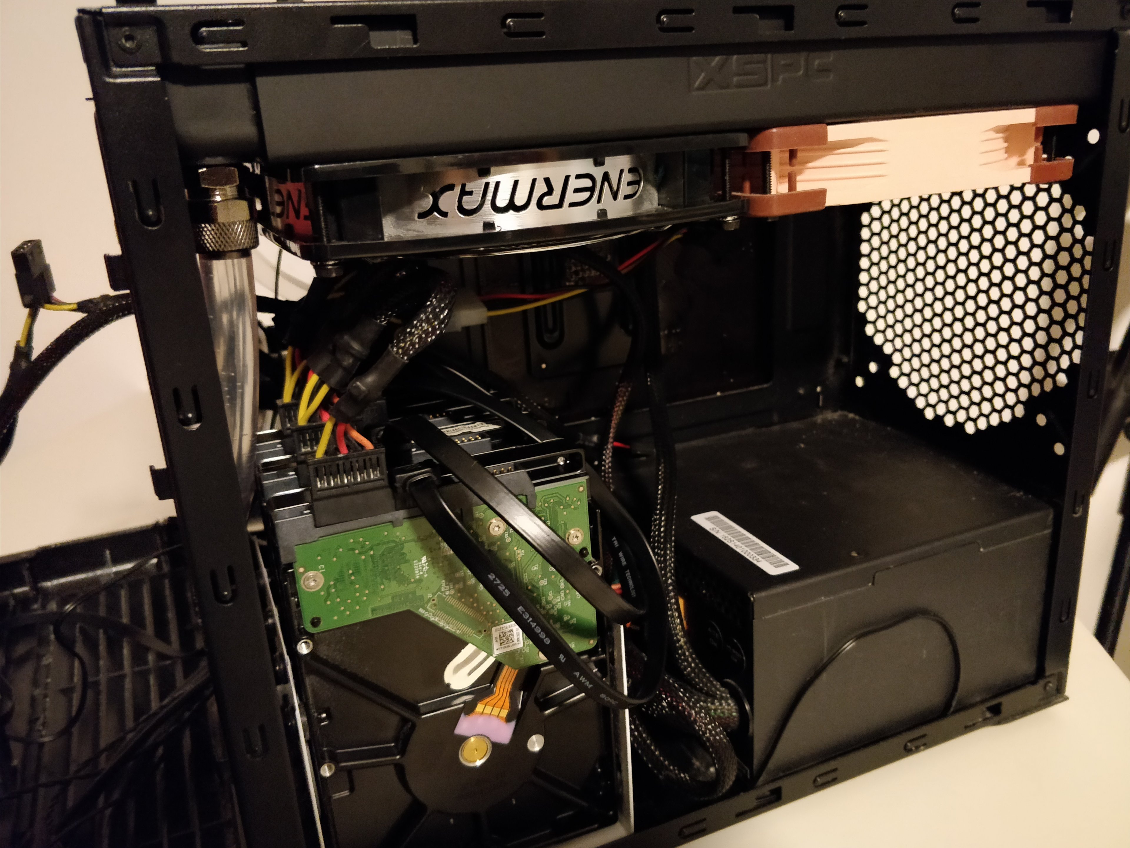 Idee 2: den Festplattenkäfig rausschmeißen und 2 der 3 Festplatten unter der GPU verschrauben (da gibts tatsächlich im Node 804 Definierte Stellen für HDDs). Die Dritte HDD entweder Ersatzlos streichen oder sie irgendwo hin Basteln (könnte man die ggf. über dem NT irgendwie befestigen?)