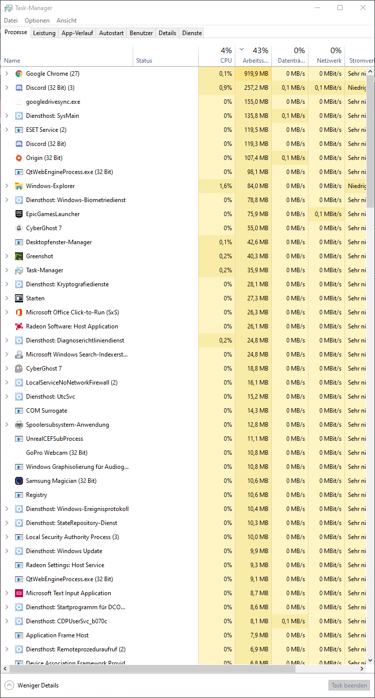 Origin, ganz viel Chrome, Microsoft Teams, Desktopfenster Manager, Steam, Greenshot, Cyber Ghost 8...sogar der Windows explorer.