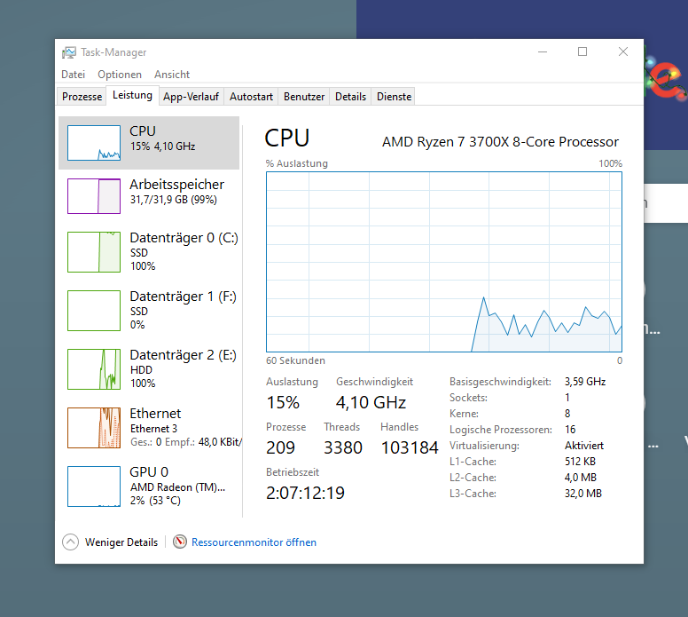 ich muss das Thema wieder hoch holen. Vorhin war es wieder so weit. Arbeitsspeicher voll C:\SSD und Festplatte E:\HDD 100% Auslastung. Festplatte F:\SSD nichts.