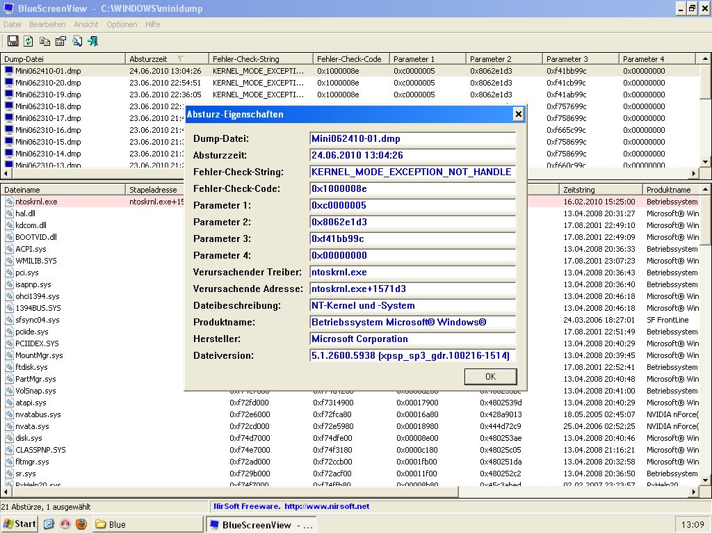 Also ich seh den Desktop,es lädt alles ganz normal,doch dann nach ca 20sek kommt nur ganz kurz auf der Hälfte des Bildschirmes ein Bluescreen.Von dem kann ich leider nix lesen da er nur ganz kurz auftaucht.Danach startet mein System neu.Ich dachte schon an nen Ramstick.Ich hab 4 davon.Hab auch mal alle raus und nur 2mal nur einen reingesteckt aber daran liegts wohl nicht.Hab gelesen kann auch Netzteil oder Festplatte sein.Was kann ich jetz machen um den Bluescreen festzuhalten?