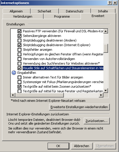 Dann aktiviere mal das "Visuelle Stile auf Schaltflächen und Webseiten" aktiviert ist, unter erweiterten Inetoptionen. Du kannst auch die erweiterten Einstellungen zurücksetzen und die Internet Explorer Einstellungen zurücksetzen.