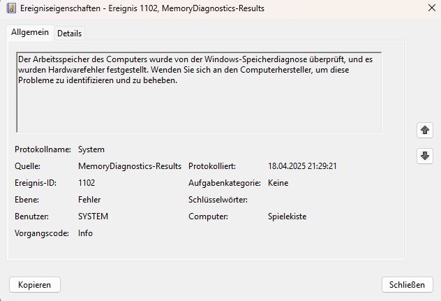 Ich habe o.g. Hardware in den letzten Wochen zusammengekauft und vor einigen Tagen zusammengebaut. Die Windowsinstallation ist ebenfalls neu. Gut ist, dass ich so, wenn das fehlerhafte Bauteil identifiziert ist, hoffentlich unkompliziert Ersatz (Gewährleistung) bekomme. Der PC stürzt unregelmäßig ab. Beim Browsing und Windowsnutzung läuft er flüssig. Ich habe noch nicht viele Spiele testen können, weil ich lange keinen PC hatte und dementsprechend nur wenige aktuelle Spiele habe.