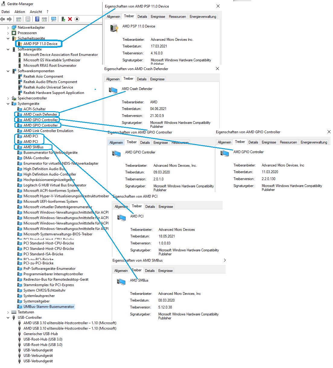 Ist zwar sehr bequem (für dich) und ausführlich, aber ich schätze dass keiner die einzelnen x-hundert Treiberdateien abchecken wird und kann. Da sind viele System-/Windows-Treiber dabei, die kann man gar nich einzeln 'explizit' installieren oder updaten. Die Treiber-Versionen der einzelnen Komponenten, auf die's hier ankommt, mit Hersteller und Datum, kann man dem Gerätemanager entnehmen.weltauge schrieb:Hab ma Liste der Treiber angehängt.