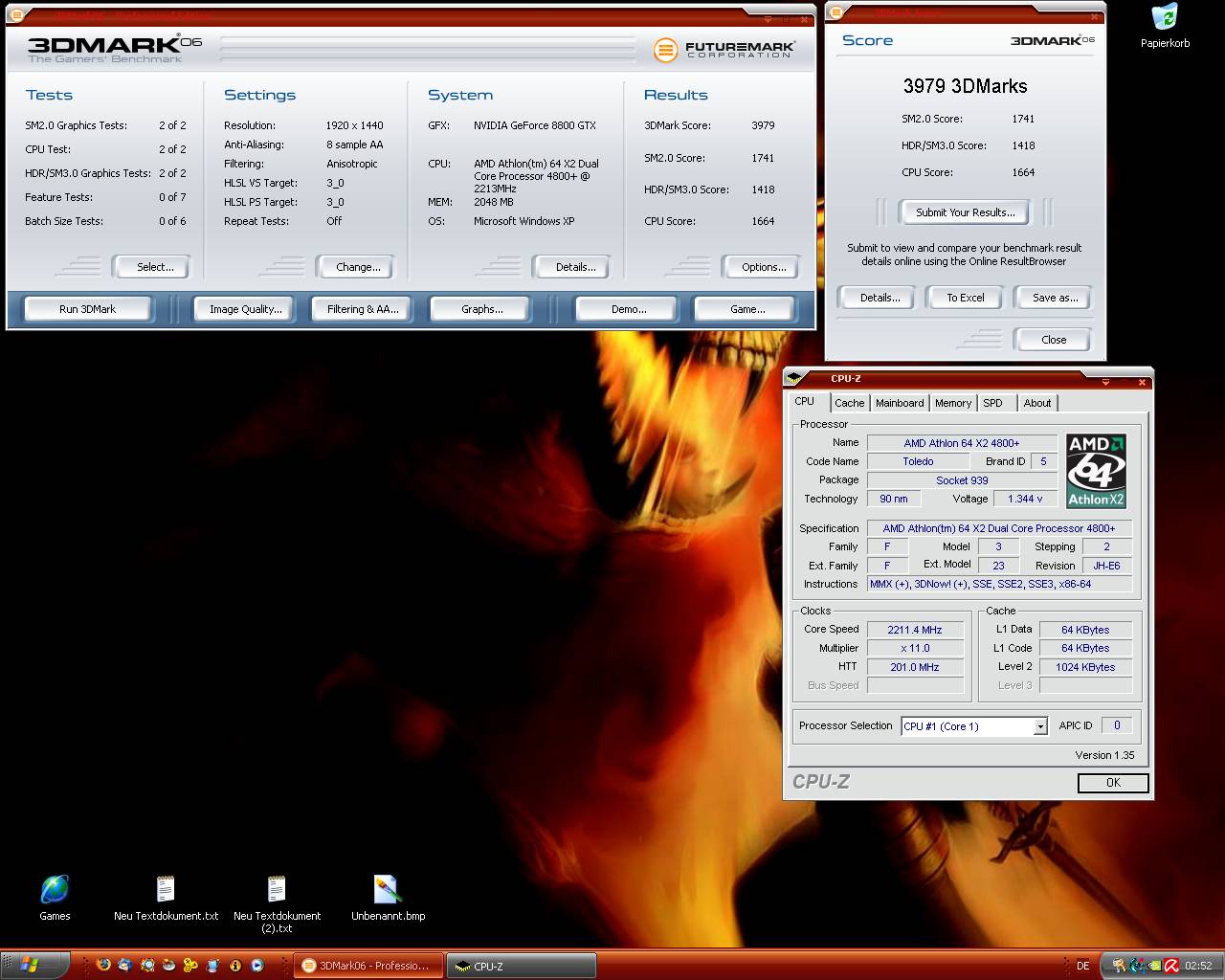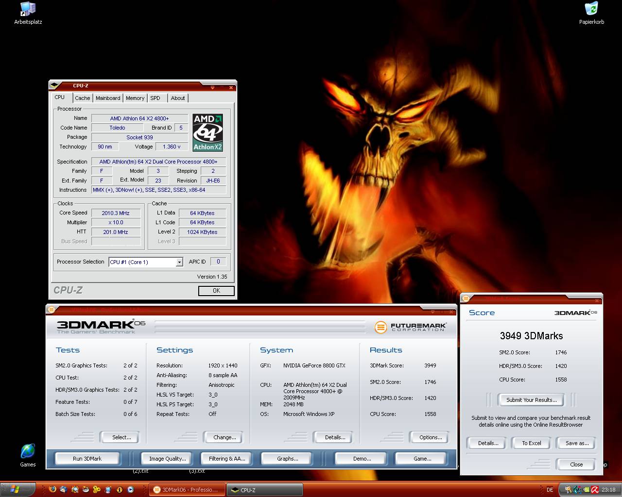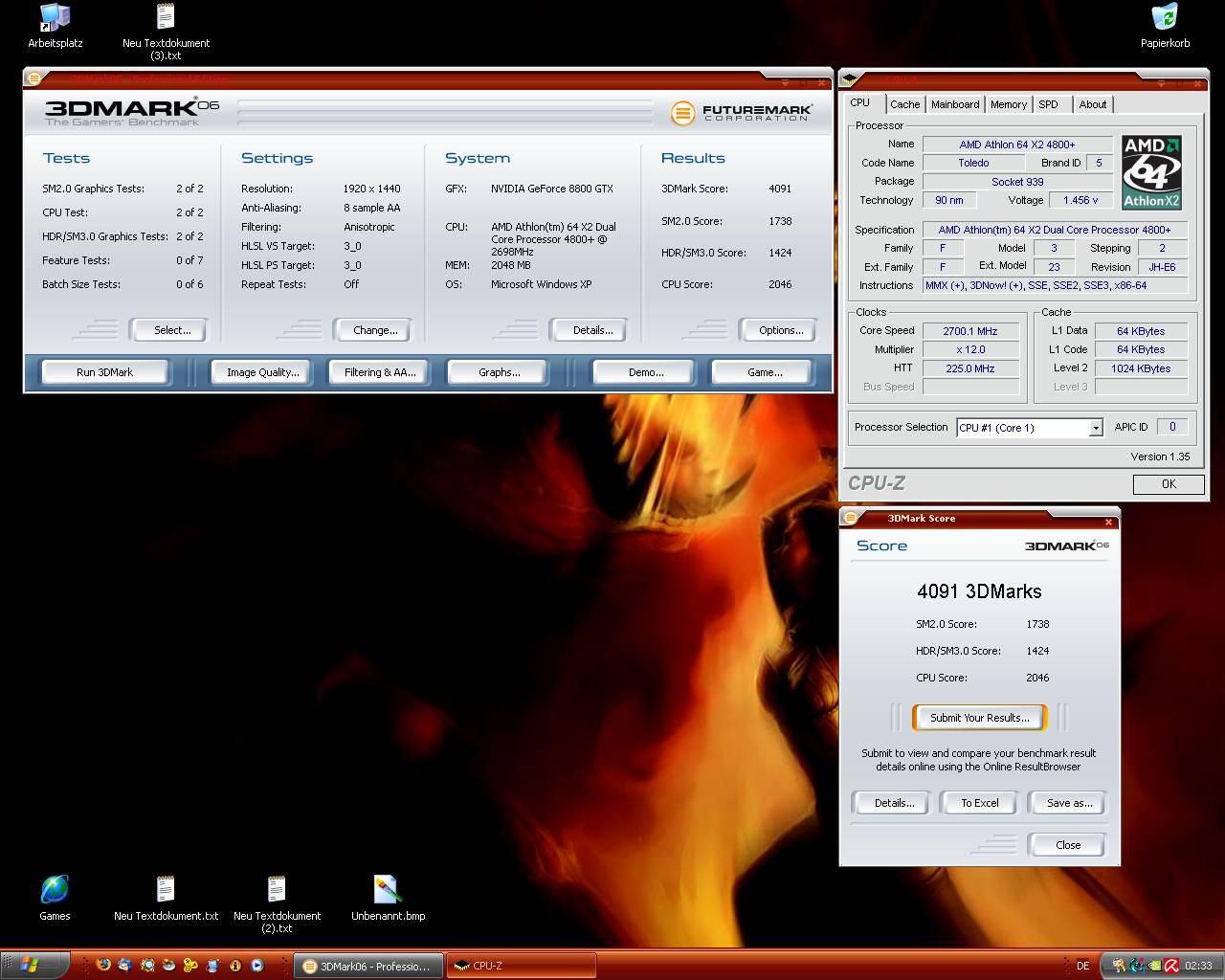 Meine CPU AMD X2 4800+ lief mit 2,0Ghz; 2,2Ghz und mit 2,7Ghz im 3DMark06.