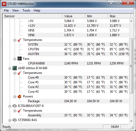 Das merkwürdige ist auch, dass mir in SpeedFan aufeinmal angezeigt wird, dass die CPU ca. 35° C warm ist und bei Core steht was von 60° C und das im normal Betrieb, also nicht unter Last. Ich verstehe das nicht wenn ich erlich bin.