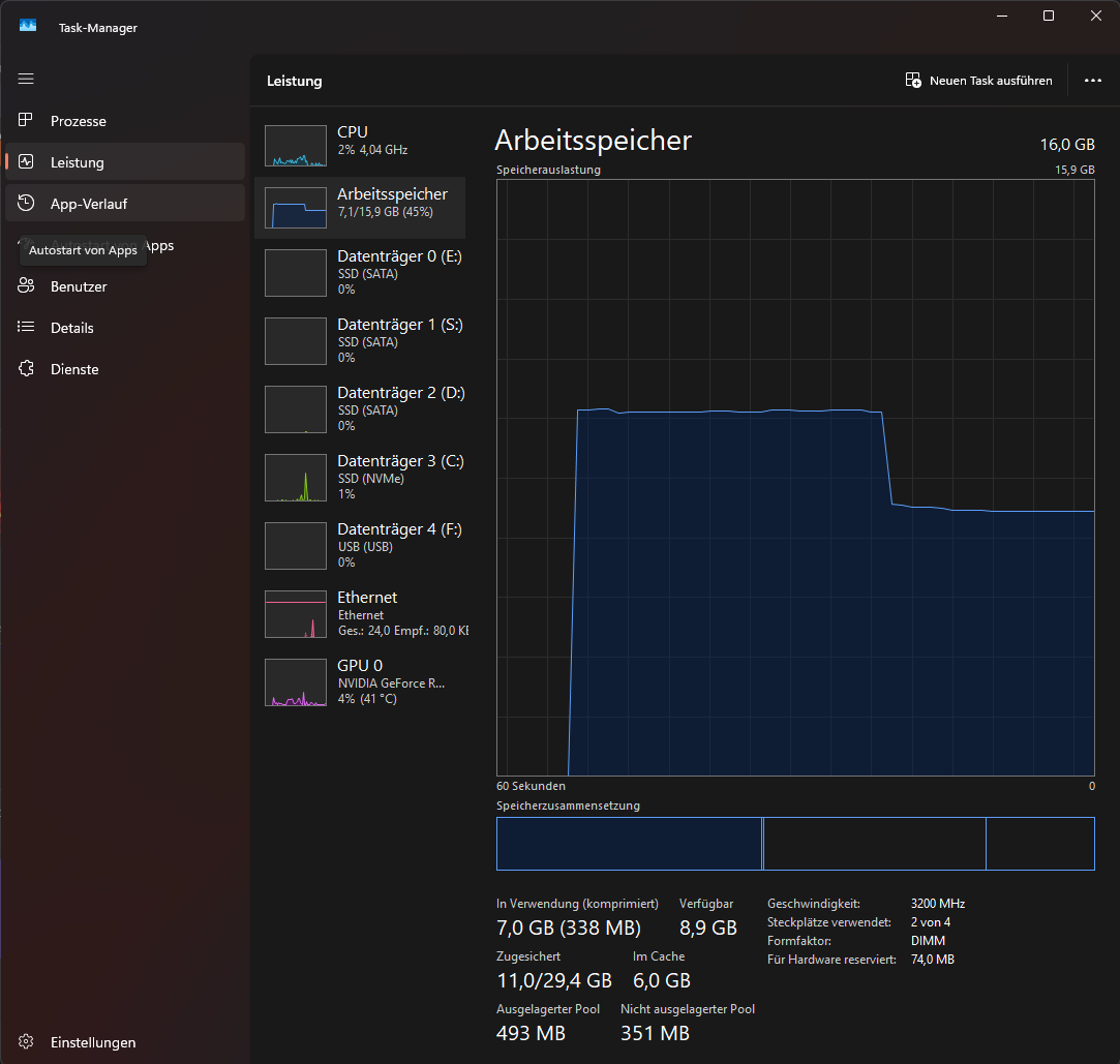 Der Task-Manager bestätigt, dass der RAM auf 3200 MHz läuft.