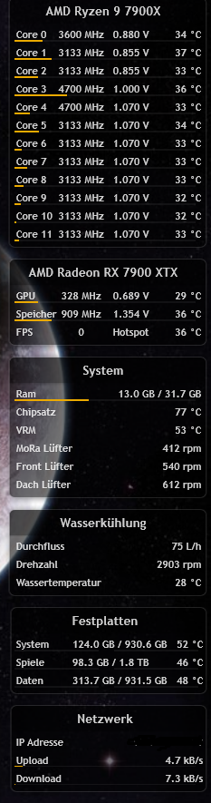 Das System (Temperaturen, Leistungsaufnahme etc.) wird über die Aquasuite auf einem zweiten Monitor überwacht. Das stört dann beim Zocken nicht.