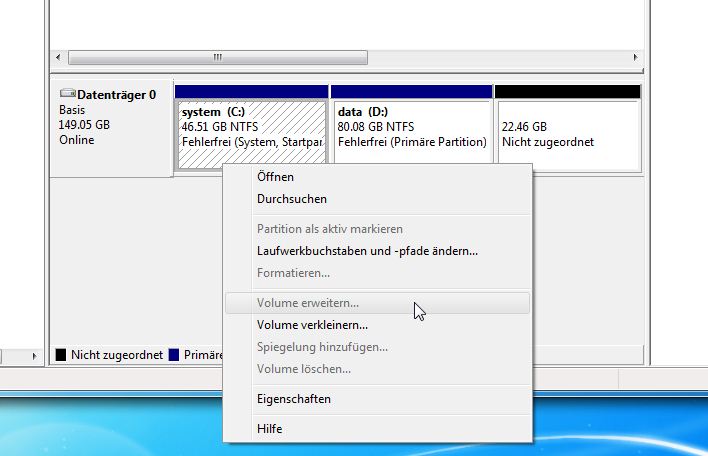 Das D: könnte ich problemlos vergrössern, beim C: geht das aber nicht mehr (siehe Screenshots). Verkleinern würde gehen...