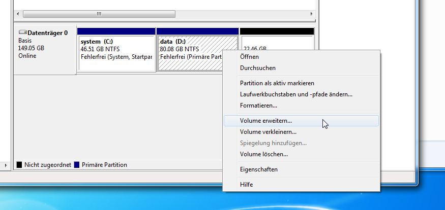 Ich habe einen Laptop mit einer 160GB SSD. Die Festplatte habe ich momentan in zwei Partitionen aufgeteilt. Leider lässt sich nun das C: (wo Windows installiert ist) nicht mehr vergrössern.