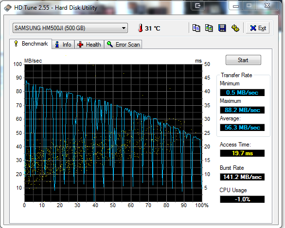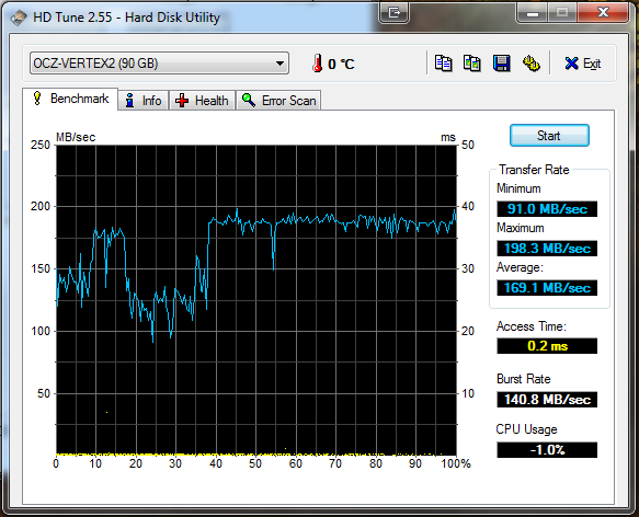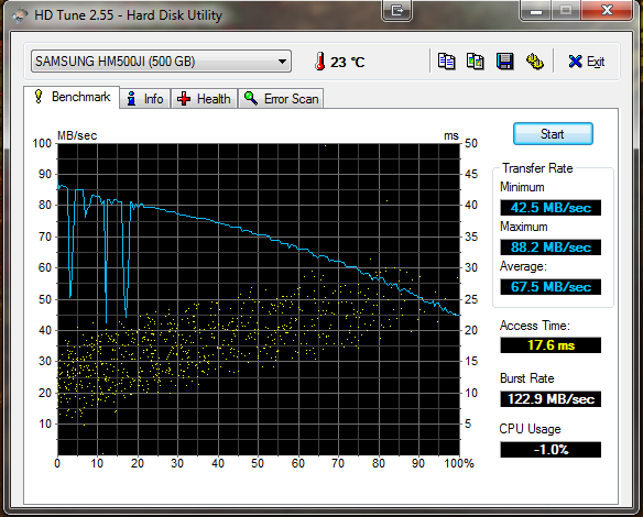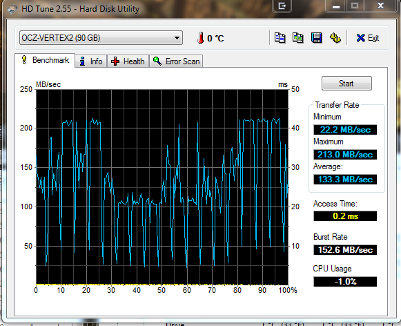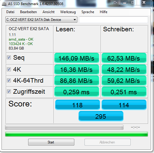 Seit einer Neuinstallation meines Systems bricht bei HD Tune die Transferrate meiner SSD immer wieder ein (siehe Screenshot 1). Der zweite Screenshot zeigt eine ältere Messung wie das eigentlich mal ausgesehen hat.