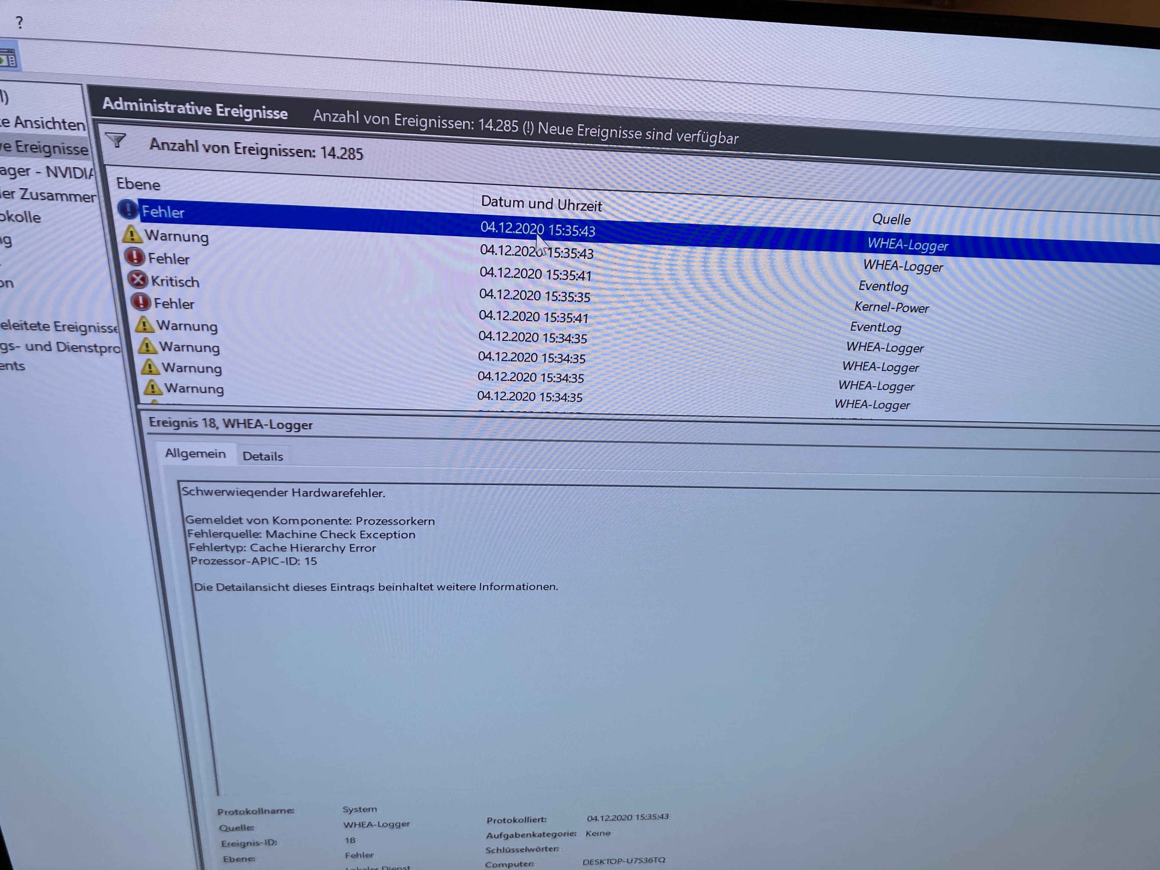 Auf zwei der angehängten Bilder sieht man den Fehlerzeitpunkt aus dem Ereignisprotokoll: Ereignis ID41 von Kernel-Power (Fehlercodes nicht befüllt). Das Ganze wird begleitet von tausenden Warnungen Ereignis ID19 von WHEA-Logger über einen behobenen Hardwarefehler.