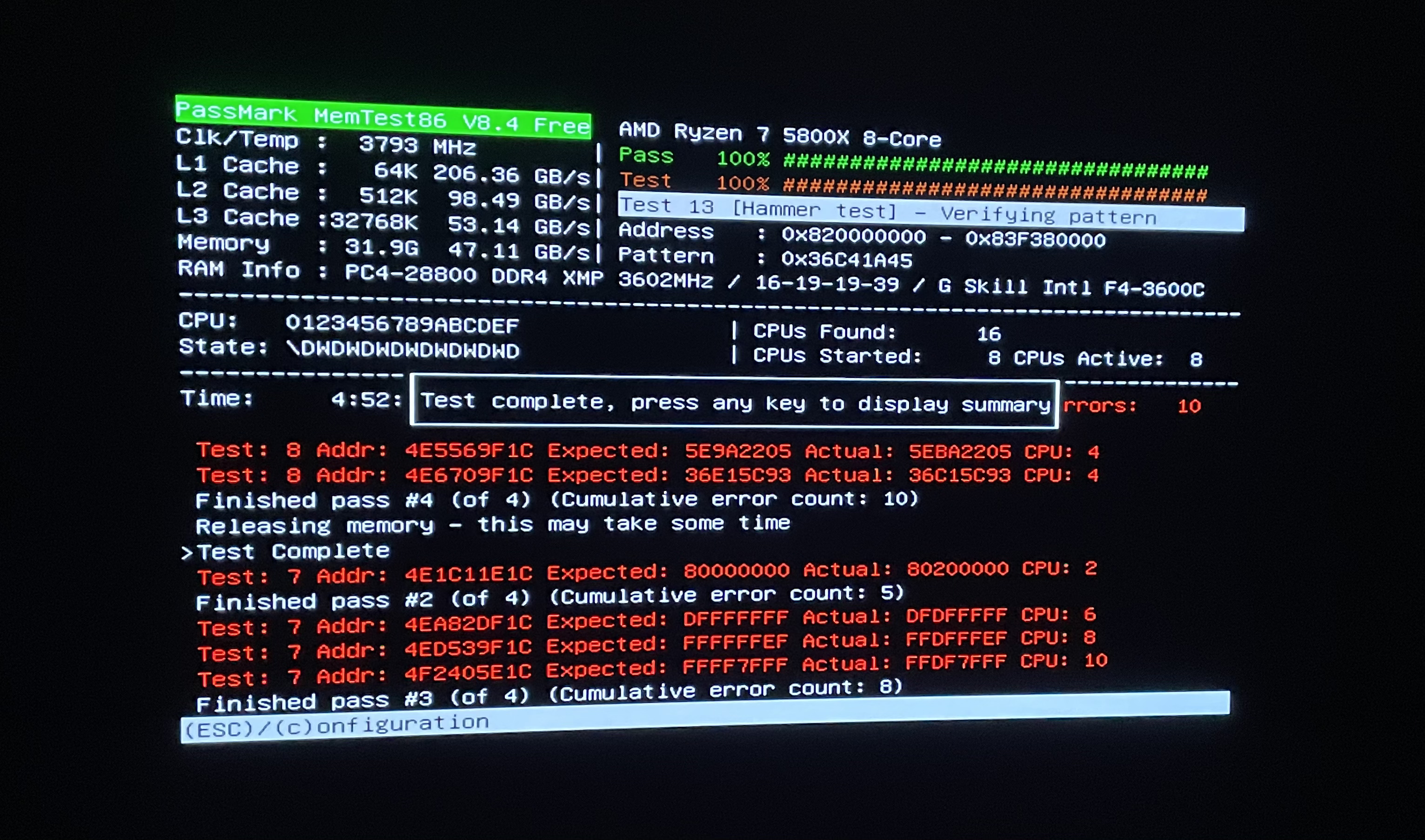 Um den RAM auszuschließen habe ich Memtest86 laufen lassen. Der Test ist nach kurzer Zeit mit einem Error abgebrochen (siehe angehängtes Bild). Memtest hat sich dabei komplett aufgehängt. Zur Sicherheit hab ich dann nochmal xmp deaktiviert und da lief Memtest über eine halbe Stunde fehlerfrei. Einen Anbsturz in Windows konnte ich so während 2 Stunden Idle auch nicht festellen.
