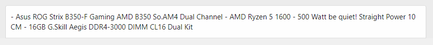 - Asus ROG Strix B350-F Gaming AMD B350 So.AM4 Dual Channel - AMD Ryzen 5 1600 - 500 Watt be quiet! Straight Power 10 CM - 16GB G.Skill Aegis DDR4-3000 DIMM CL16 Dual Kit