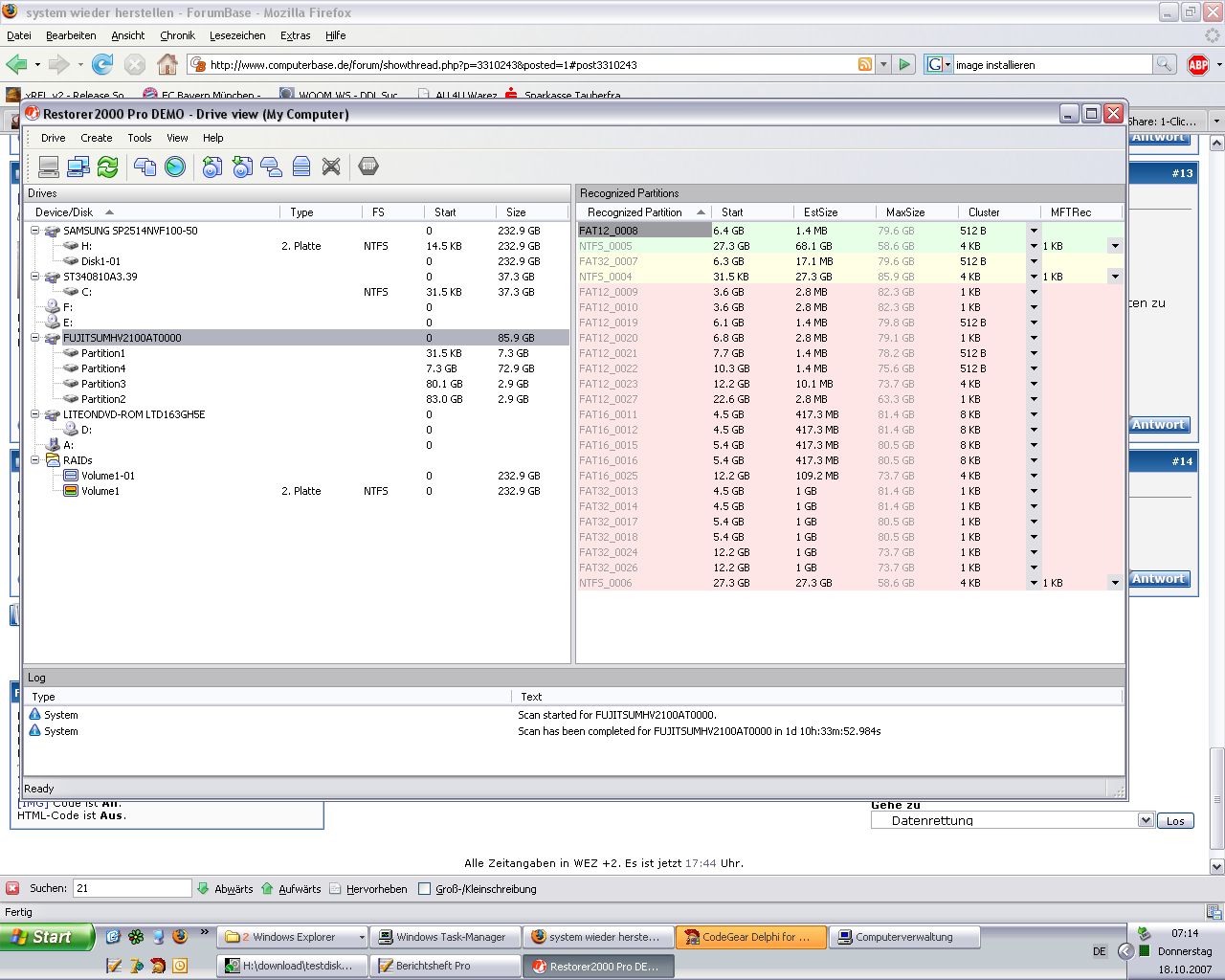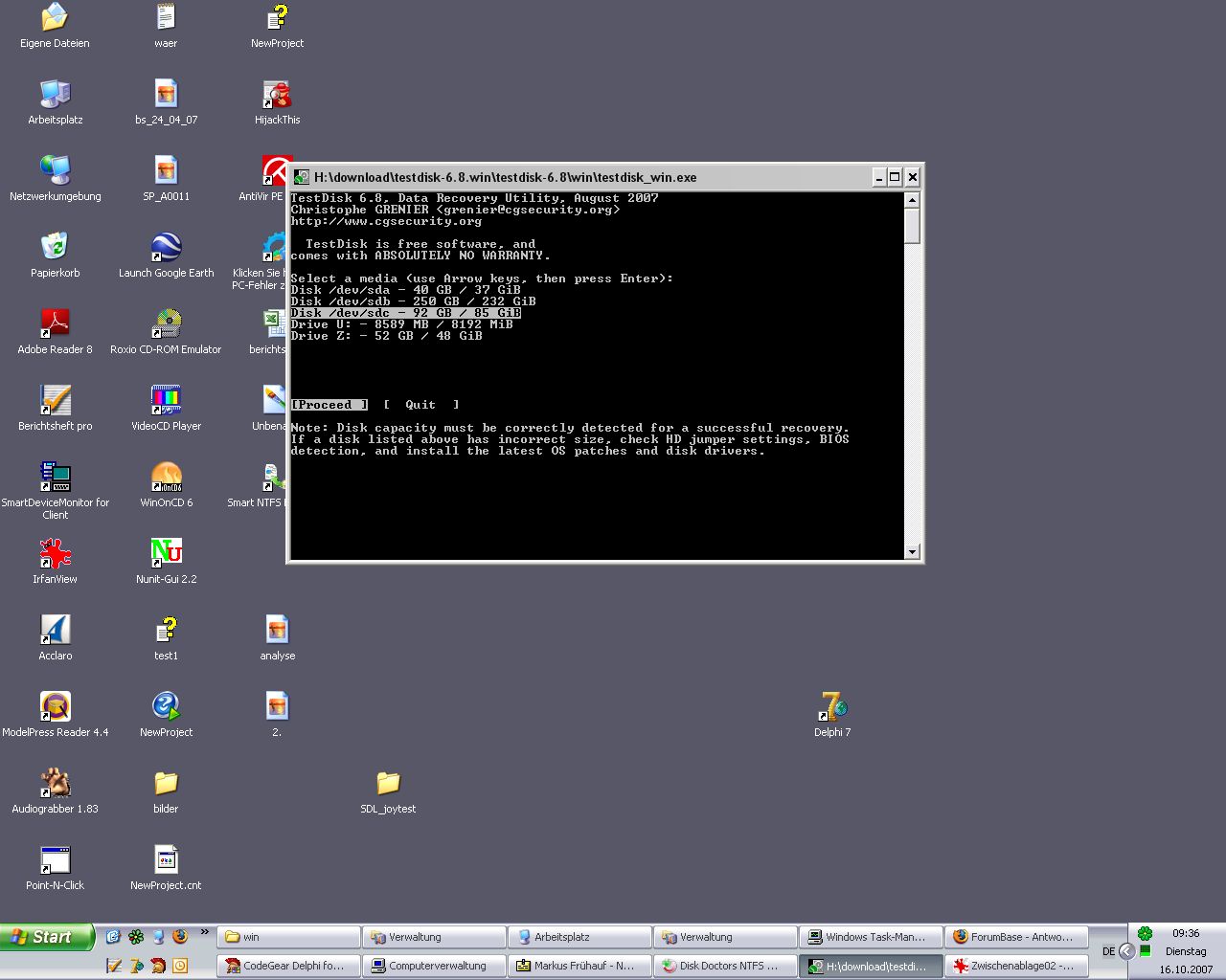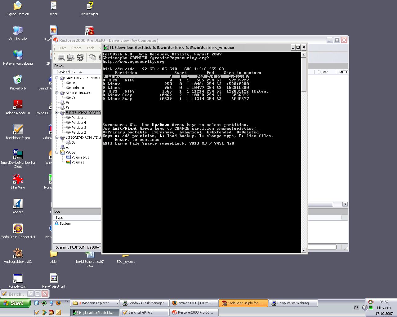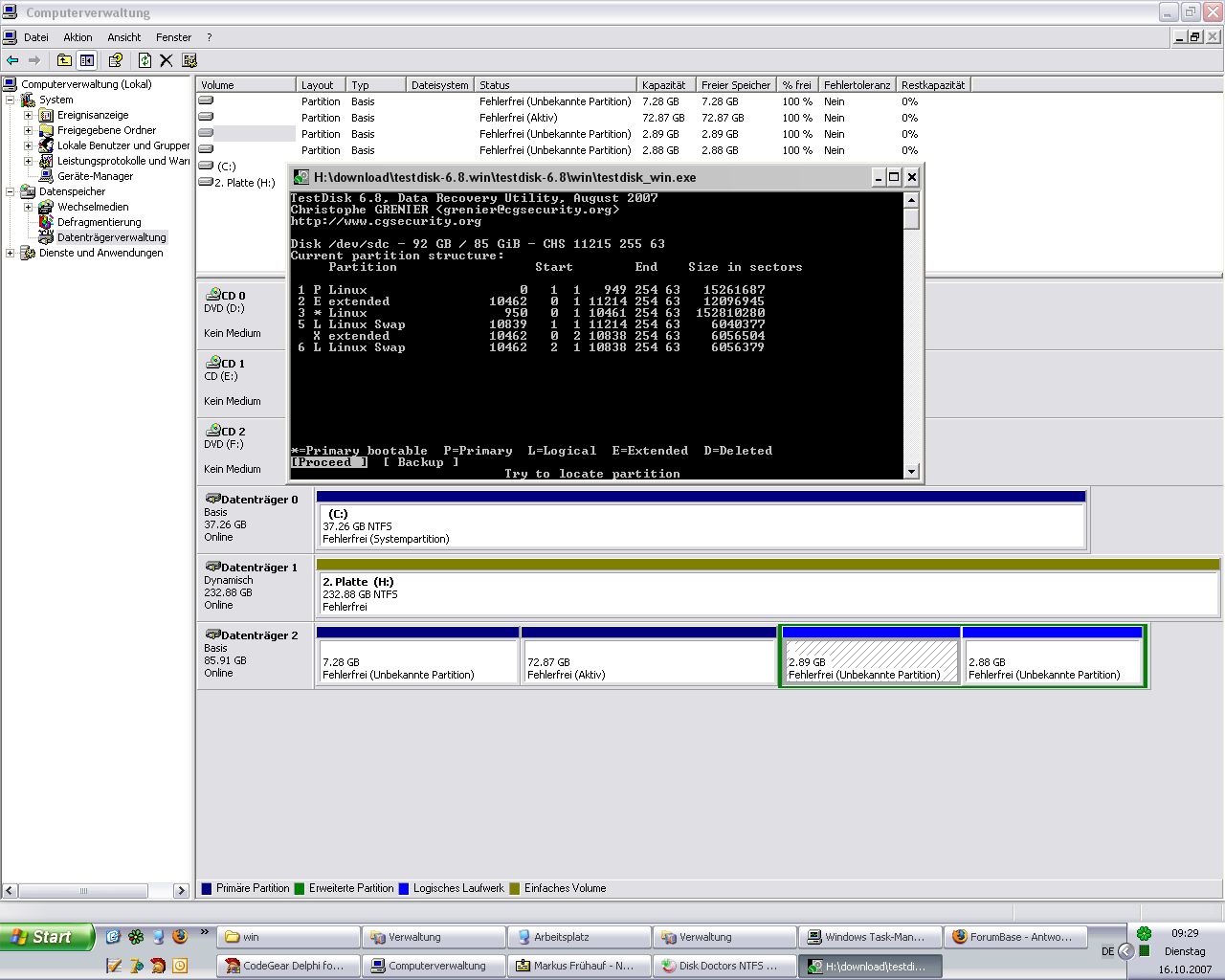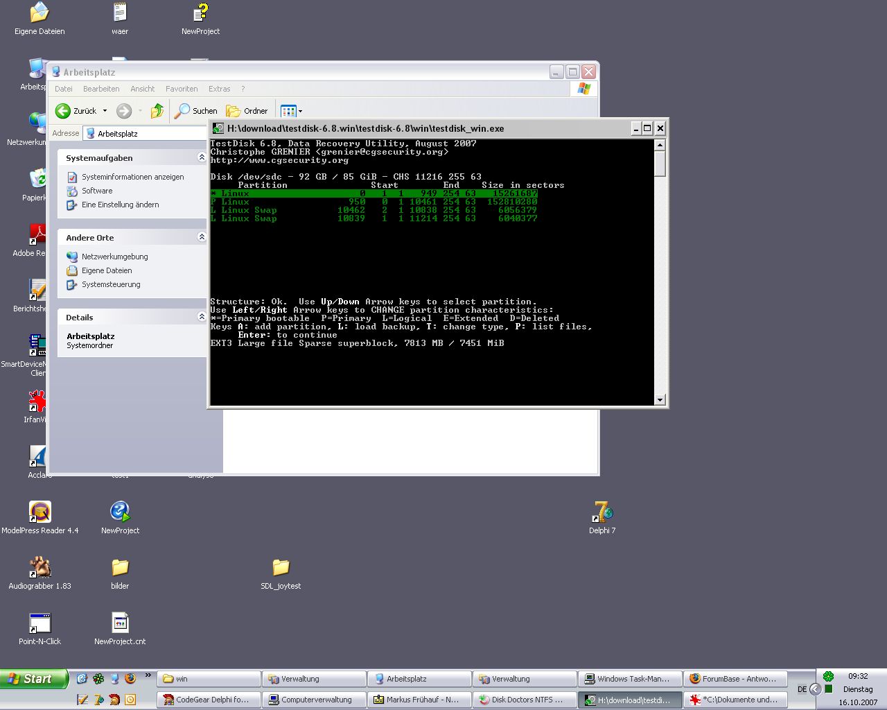 Ich hatte ein XP-Home System mit 2 Partitionen(Syste+Daten) installiert. Zusätzlich wollte ich noch ein Ubuntu installieren. Bei der Installation habe ich eine Partitionsgröße ausgewählt, die geringer als der noch freie Speicher war. Wenn ich die Festplatte über einen IDE/USB Adapter an einen anderen Rechner anschließe werden in der Computerverwaltung 4 verschiedene Partitionen angezeigt, die, die ich für Ubuntu angelegt habe(7GB) bezeichnung: unbekannte parition, dann eine 72GB parition, die für XP Aktiv ist zusätzlich sind noch 2 paritionen mit jeweils 3 GB angelegt worden, die auch für xp unbekannt sind. Alle 4 partition bezeichnet der rechner als fehlerfrei. Ist es möglich die Ubuntu installation rückgängig zu machen bzw. irgendwie auf meine Daten zuzugreifen? Auf meiner Datenpartition liegt ein kürzlich angelegtes Image meiner ehmaligen Windowssystempartition, aber da komm ich ja jetzt nicht mehr ran.