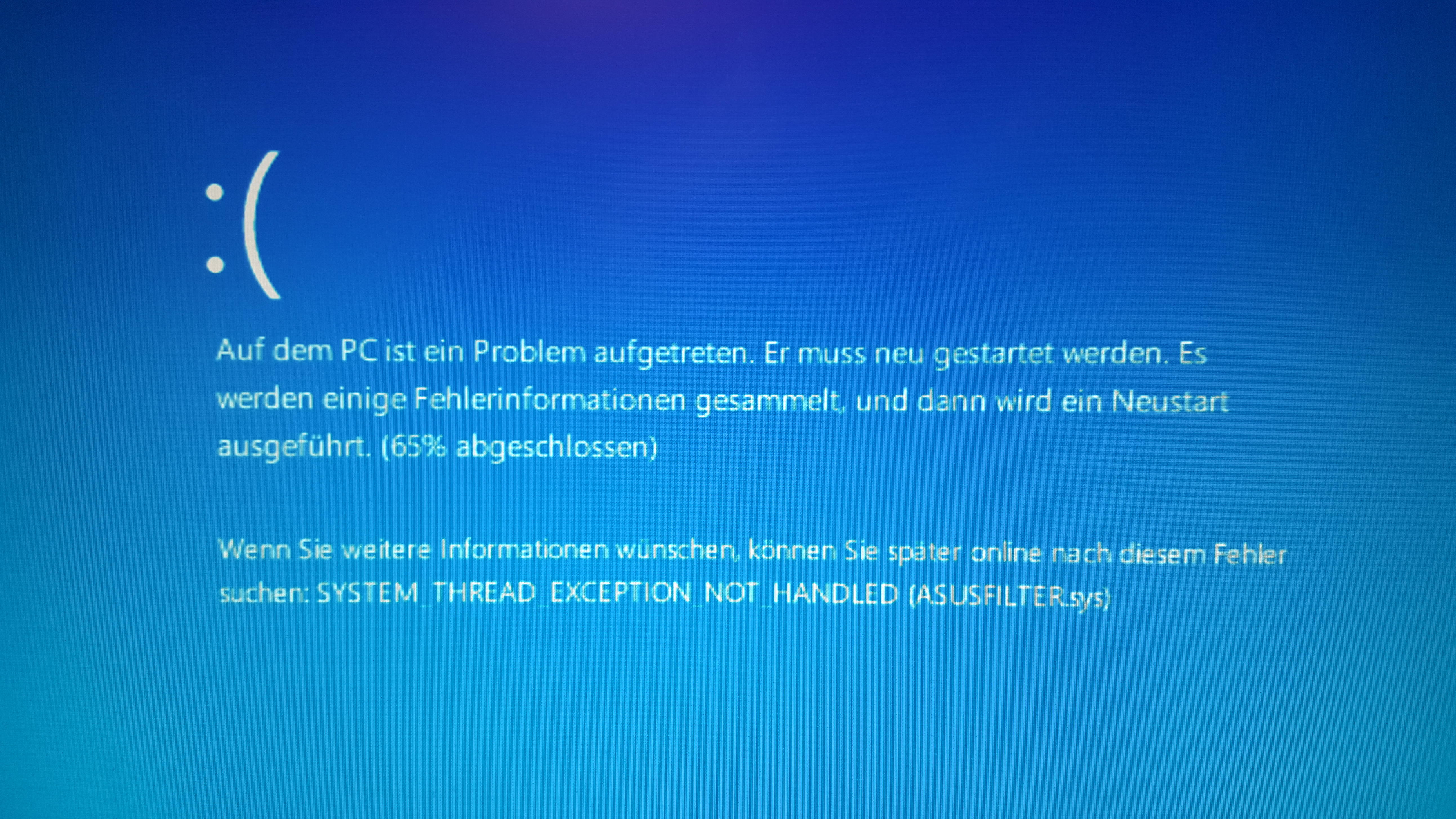 Ich hab von Win 8.1 auf Win 10 64bit updatet. Alles lief perfekt bis vor 2 Wochen. Seit dem hab ich immer einen bluescreen mit dem Text System_thread_exception_not_handled (asusfilter.sys) Der kommt bei jedem aufstarten oder wenn ich ihn vom Stand by wecke. Ich hab in einem Forum schon geschrieben und nur 2 Tipps bekommen. Seit dem nichts mehr, darum hier der Versuch.