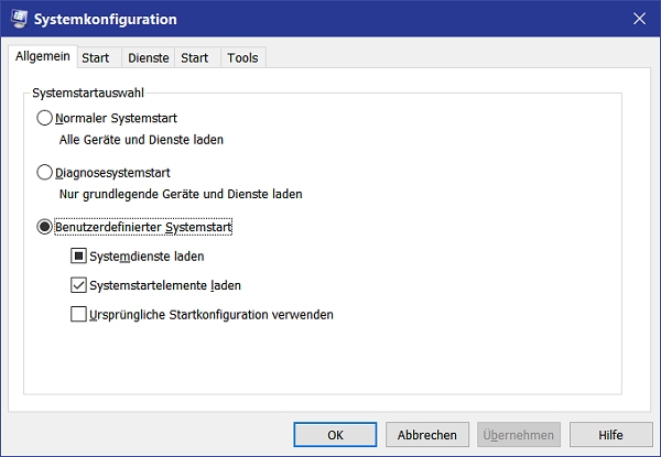 Kannst du das Testweise umstellen auf Benutzerdefiniert? Ich kanns zwar einstellen und abspeichern...danach ist es aber gleich wieder bei "Normaler Systemstart"cvzone schrieb:Springt das nicht schon auf "Benutzerdefiniert", wenn man nur ein einziges Objekt im Autostart selber deaktiviert?
