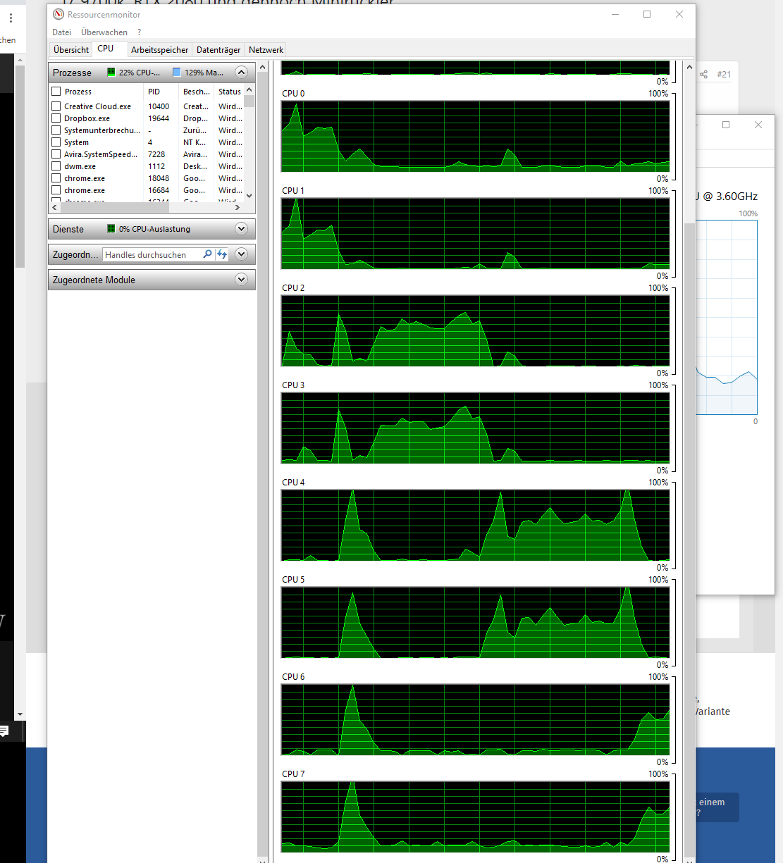 Temperaturen und Auslastung von GPU und CPU sind völlig im grünen Bereich. Allerdings ist mir aufgefallen, dass im Ressourcenmonitor die einzelnen Kerne abwechselnd bis zu 100% hochgehen (siehe Screenshot). Während die Gesamtauslastung irgendwo bei 25% liegt. Ist das normal?