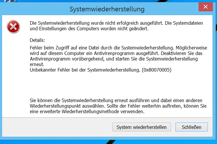 Wie dem auch sei, ich wollte einfach eine Wiederherstellung machen und bekam dann die Fehlermeldung " 0x80070005"