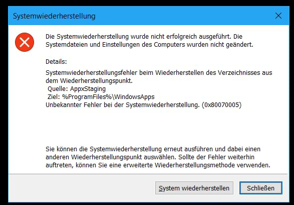 Ich erhalte, von den zwei Wiederherstellungspunkten die ich habe, immer dieselbe Fehlermeldung: