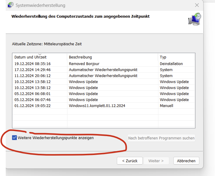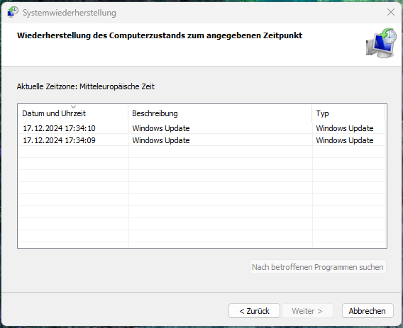 Jetzt komme ich zum Punkt: warum habe ich nur 2 Wiederherstellungsdateien? Beide Dateien vom 17.12. um 17:34 und um 1 Sekunde auseinander. Das sind die einzigen. Keine Datei von letzter Woche?