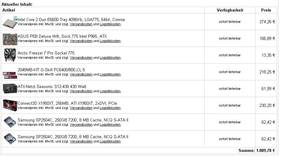 300-400€ sollten doch zusammenkommen für 2x160GB Samsung IDE, AMD Athlon64 3200+ 1MB L2,ASUS X800XTPE 1GB Corsair, MSI K8TNeo FiS2R und Be Quiet 400W oder?