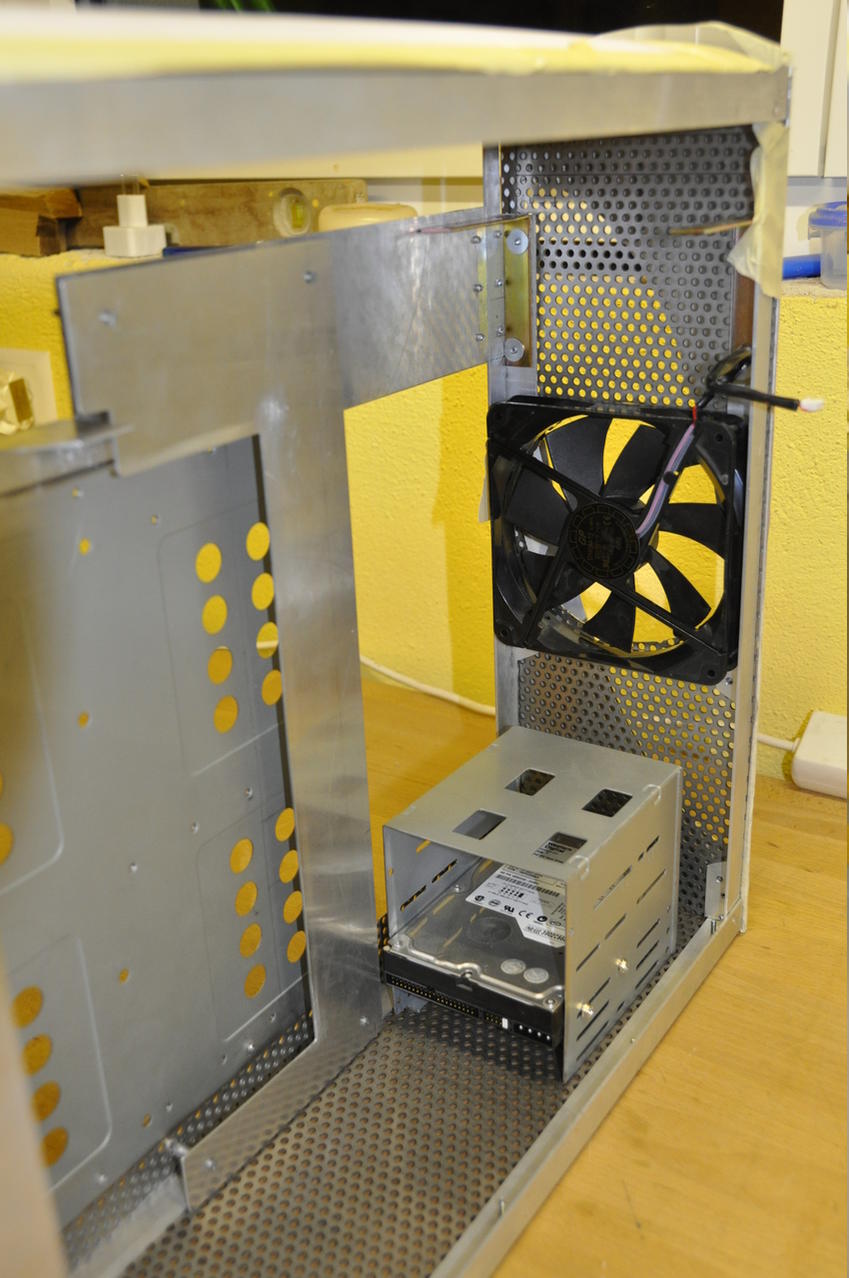 Das erhöhte Blech rechts am Mainboardschlitten dient als Kabel(-Sicht)-Abschirmung, da ich kein Platz auf der Rückseite habe.