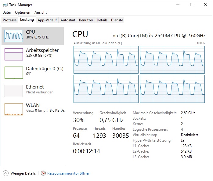 Der faule Taschenrechner mit i5 2450M gammelt mir zu lange bei 800 MHz rum. Selbst bei Prime95 kommt er nicht an seine Leistungsgrenze und will lieber pennen. Ich habe die Auslastung mit Prime95 simuliert und das auftretende Muster aufgenommen.