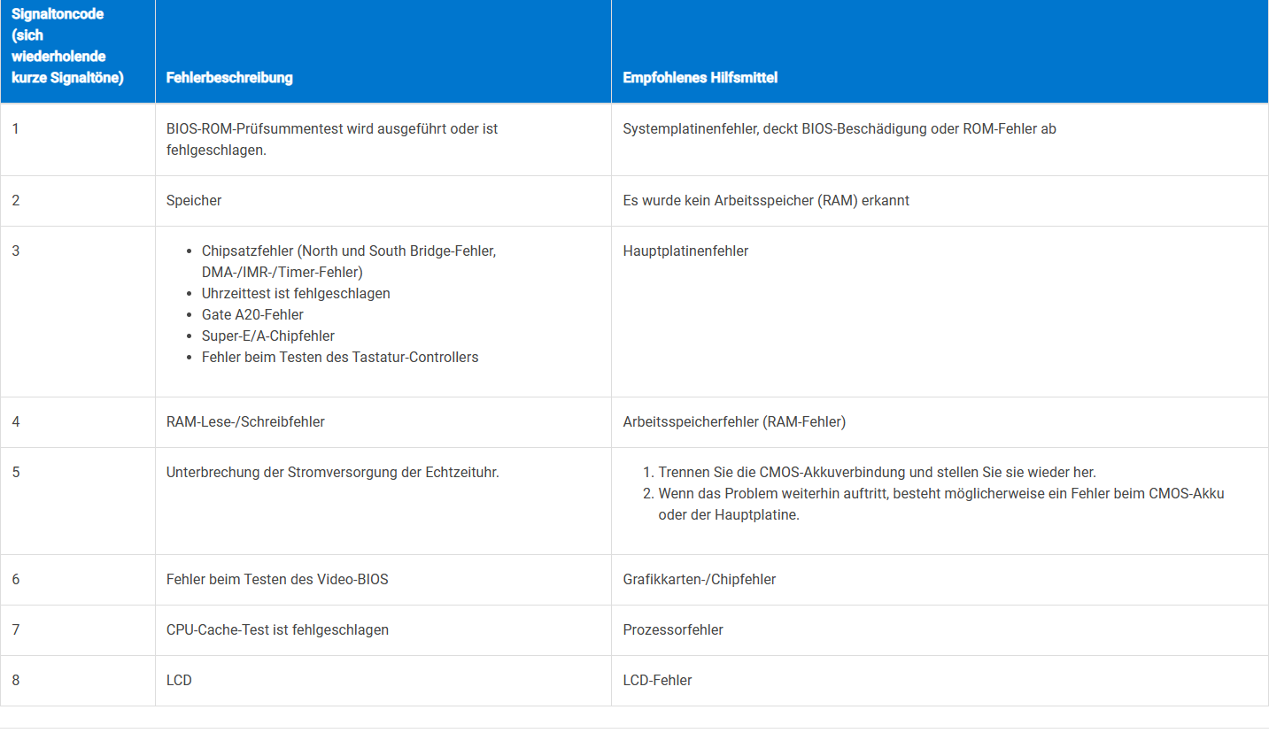 Manchmal erhalte ich (nicht bei jedem Start) auch eine Abfolge von Pieptönen die wohl als Fehlercodes zu werten sind, mit denen ich aber leider nichts anfangen kann, da ich bisher keine Liste zu den BIOS-Codes gefunden habe...