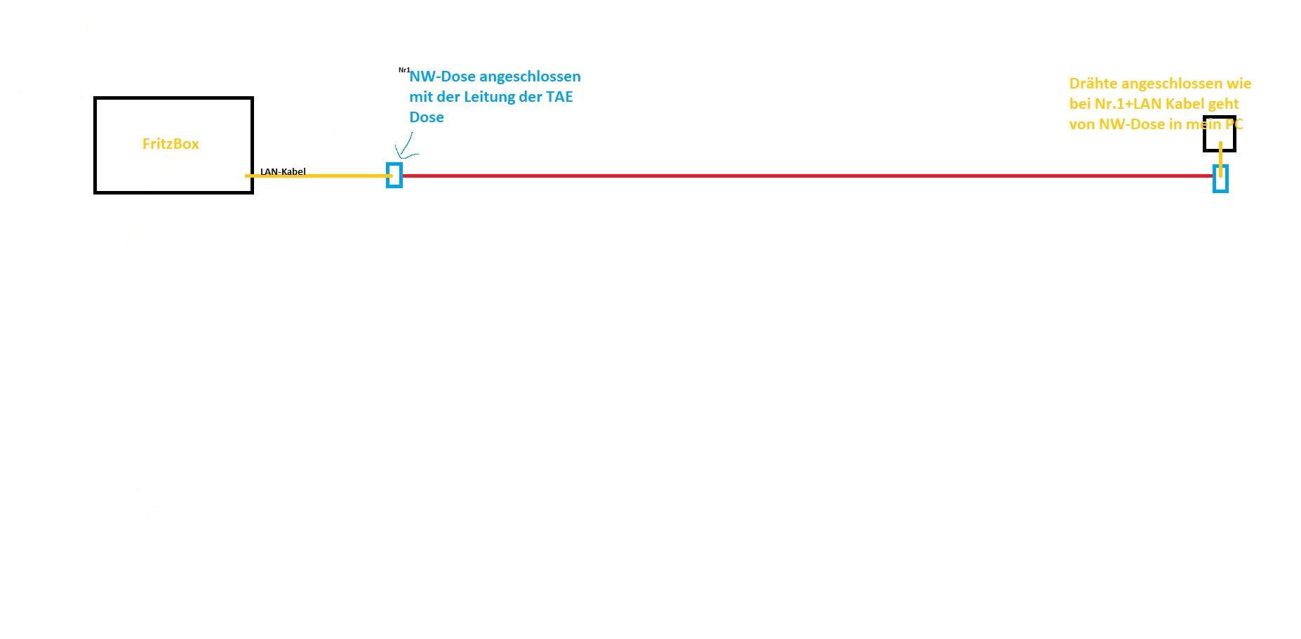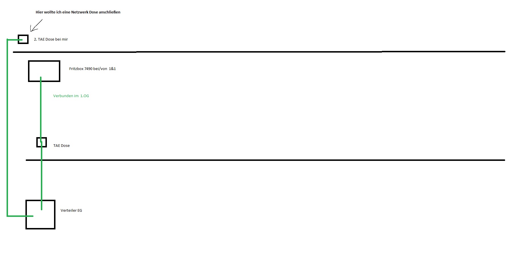 Hab hier jetzt meine TAE Dose im 3. Stock, wo die Kabel direkt zum Verteiler im Haus gehen. Im 2. Stock steht der Router, ich habe aber keine Brücke vom 2. Stock in den 3. Stock (Aussage meines Alten) Unten habe ich noch Bilder gepostet