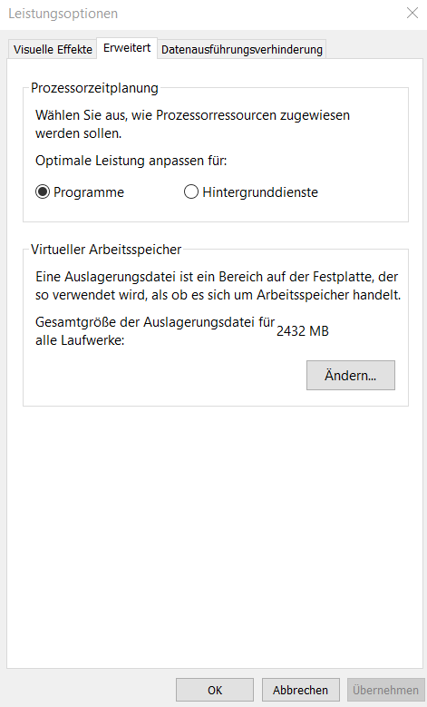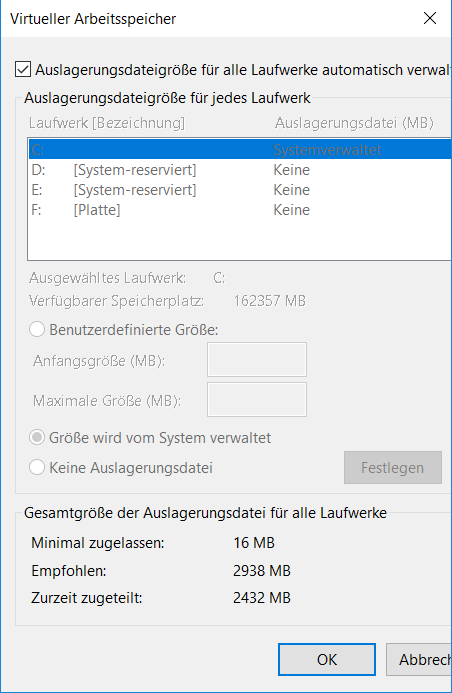 Wie hier zusehen lässt sich nicht ändern und das Fenster ist einfach nur Grau ich kann nur den oberen Haken entfernen bzw. wieder hinmachen. wenn er weg ist kann ich etwas editieren. Dann einfach bei Benutzerdefinierter Größe Anfangsgröße: 8096 - Maximale Größe: 12286 eingeben ?