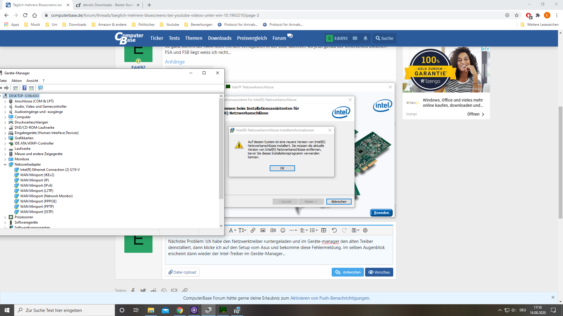 Nächstes Problem: Ich habe den Netzwerktreiber runtergeladen und im Geräte-manager den alten Treiber deinstalliert, dann klicke ich auf den Setup vom Asus und bekomme diese Fehlermeldung. Im selben Augenblick erscheint dann wieder der Intel-Treiber im Geräte-Manager, als ob ich ihn nie gelöscht hätte... oder soll ich zwischen der installation einen restart machen?