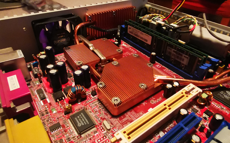 Inzwischen werkeln 4 Heatpies. Die Northbridge wurde nun auch integriert. ein weiterer Lüfter wurde eingebaut und es ist/war geplant eine neue Grafikkarte einzubauen.