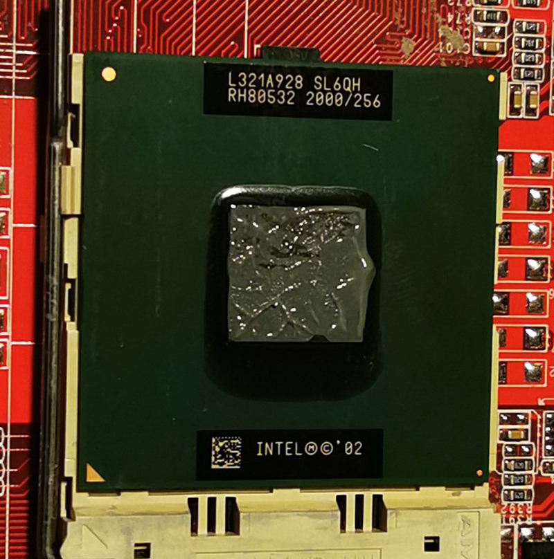 Da ich mit den P4MAM-V soundtechnisch erfolgreich war, und Mobile CPU’s von der TDP in Frage kommen, habe ich mir einen P4M mit 2.4 Ghz gekauft. Der lief leider nur mit 1.2Ghz. Schuld ist ein fester Multi auf 10. Die Celerons haben das nicht. Also ein Celeron gekauft der dann auch auf 2Ghz lief. Allerdings kann ich im Bios keine Vcore einstellen. Daher musste ich mitn Lötkolben ran.
