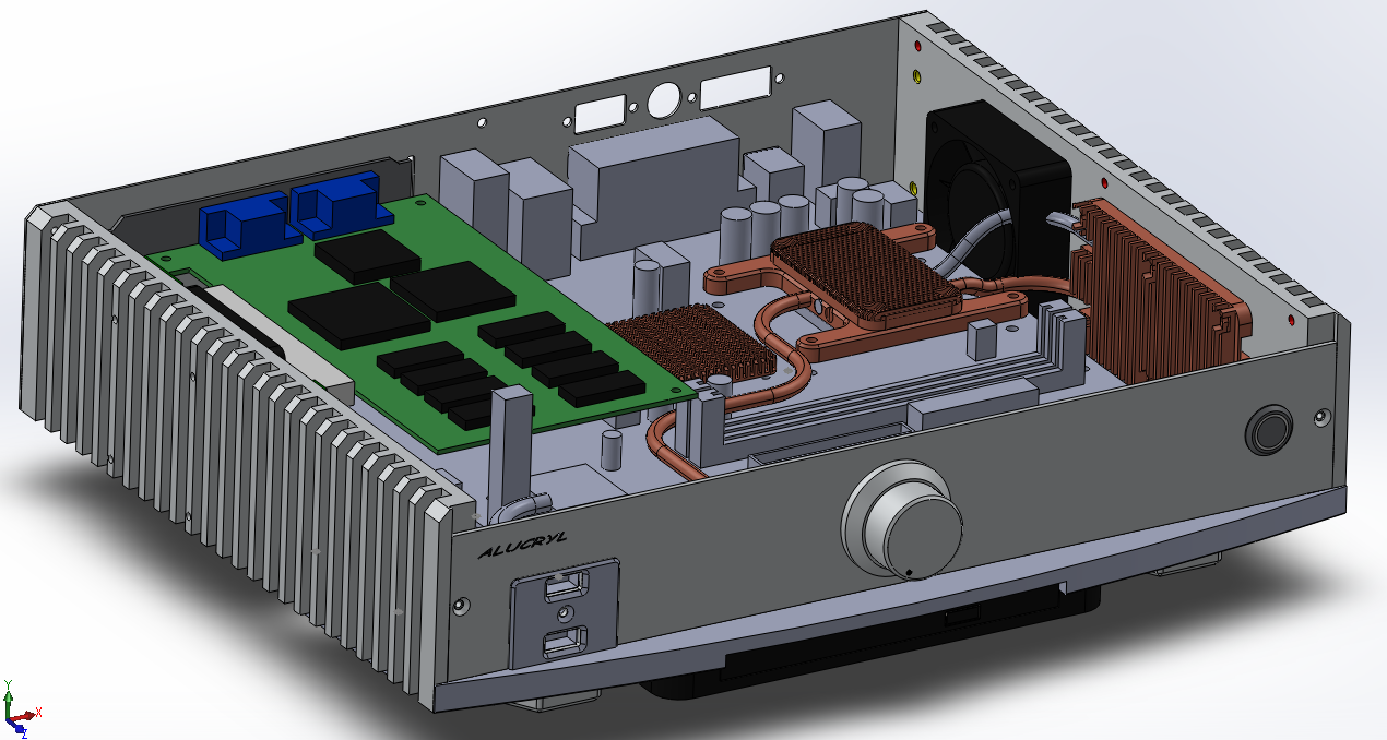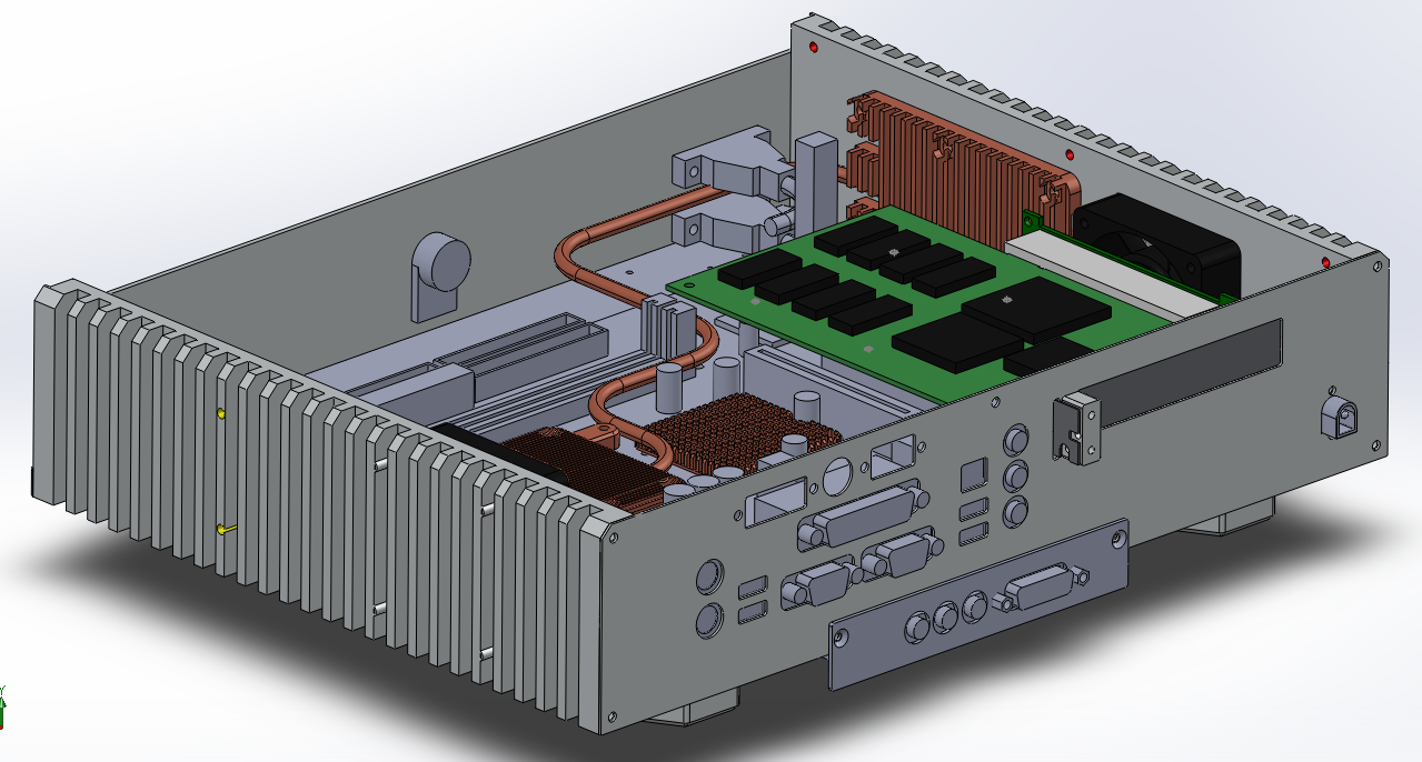 Somit habe ich das Board mal vermessen und in CAD ins Case eingefügt. Des weiteren soll es nun auch FrontUSB geben, die ENSonic SB128 PCI wurde mit eingebaut und die Kühlung wurde geupdated. Ich werde neue Kühlerkörper für die CPU und Chipset fräsen müssen dabei werde ich 2Stk. 5mm Heatpipes die aktuell drin sind noch weiter benutzen. Eine 6mm Pipe muss ich noch bestellen.