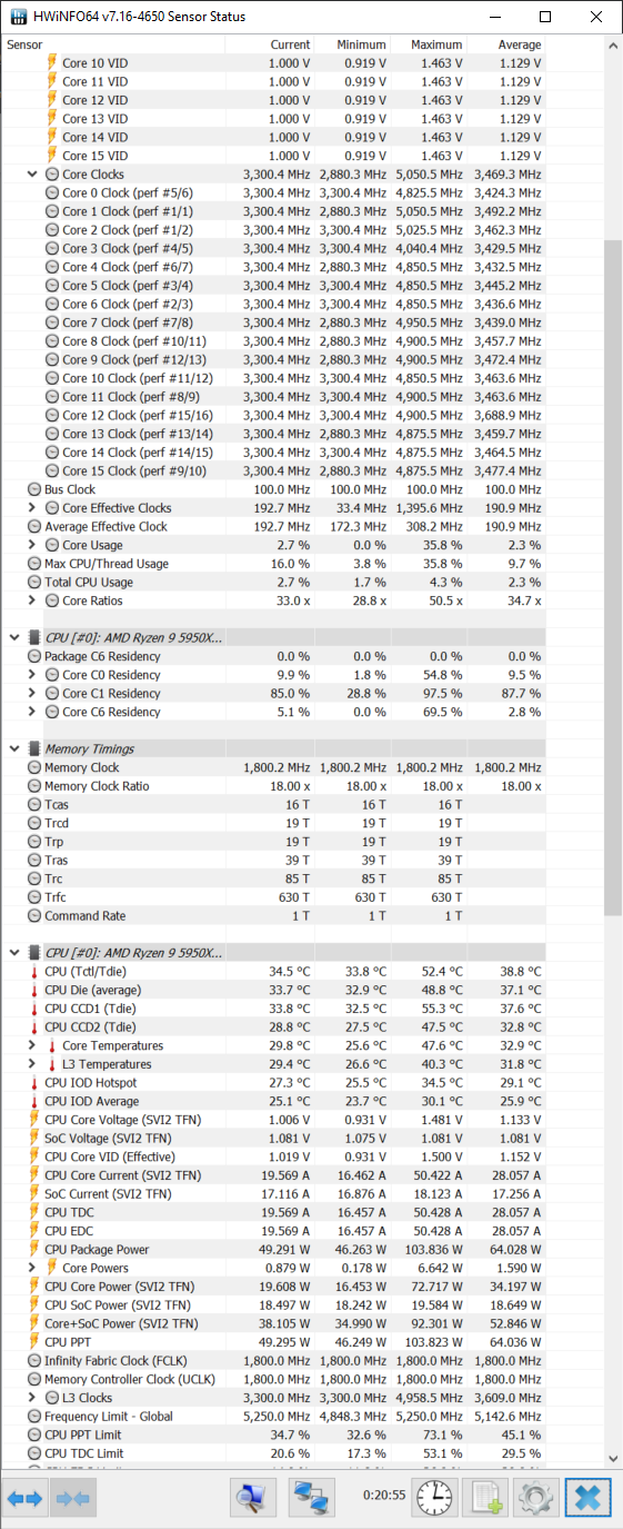 - Prozessor (CPU): AMD Ryzen 9 5950X (mit beschädigtem Memorychannel-Kontakt, wodurch der Arbeitsspeicher nur Single-Channel kann) läuft mit PBO aktiviert, jedoch nur im die Spannung pro Kern zu senken. (die 200mhz+Einstellung ist ebenfalls an, jedoch habe ich es noch nicht ohne versucht)