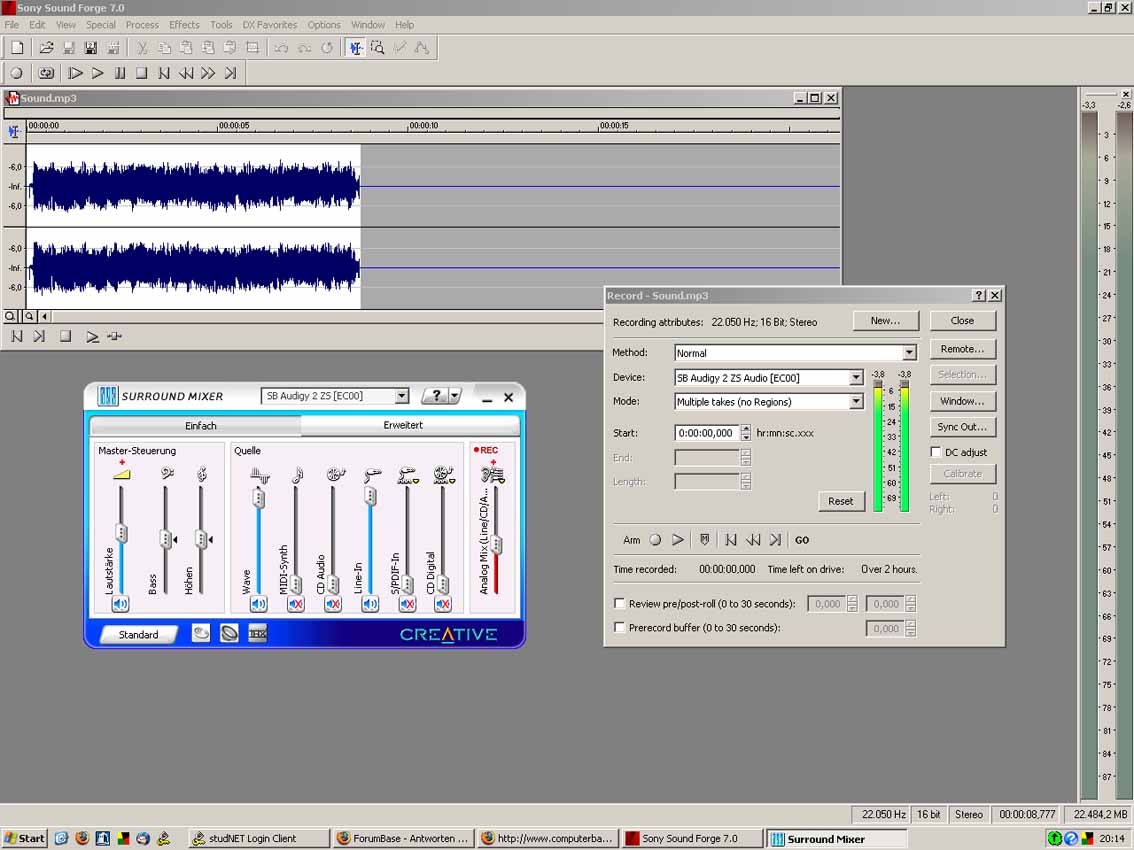 ich wollte alte Radiomitschnitte mit meinem Cassettendeck auf den Rechner überspielen. Nutzen wollte ich dazu Soundforge 7.0. Nach Anschluss des Cassettendecks an Line-In kommt ein sauberes Signal über die Lautsprecher, doch nach Aufnahme habe ich ein permanetes Kratzen vorhanden. Ich habe schon viel ausprobiert, doch leider konnte ich es nicht beheben. Woran könnte es liegen? Als Soundkarte betreibe ich eine audigy ZS 2.