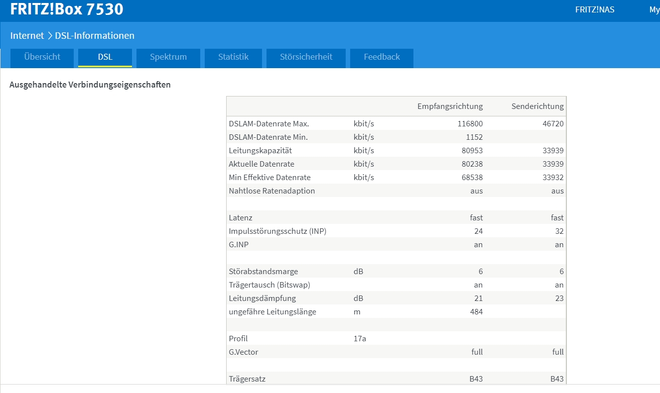 heute habe ich meine 100er Leitung freigeschaltet bekommen, an der Fritzbox kommt die neue Geschwindigkeit auch an (siehe bild), knappe 80Mbit von 100 im DL und 33Mbit von 40 im UL liegen schonmal an!