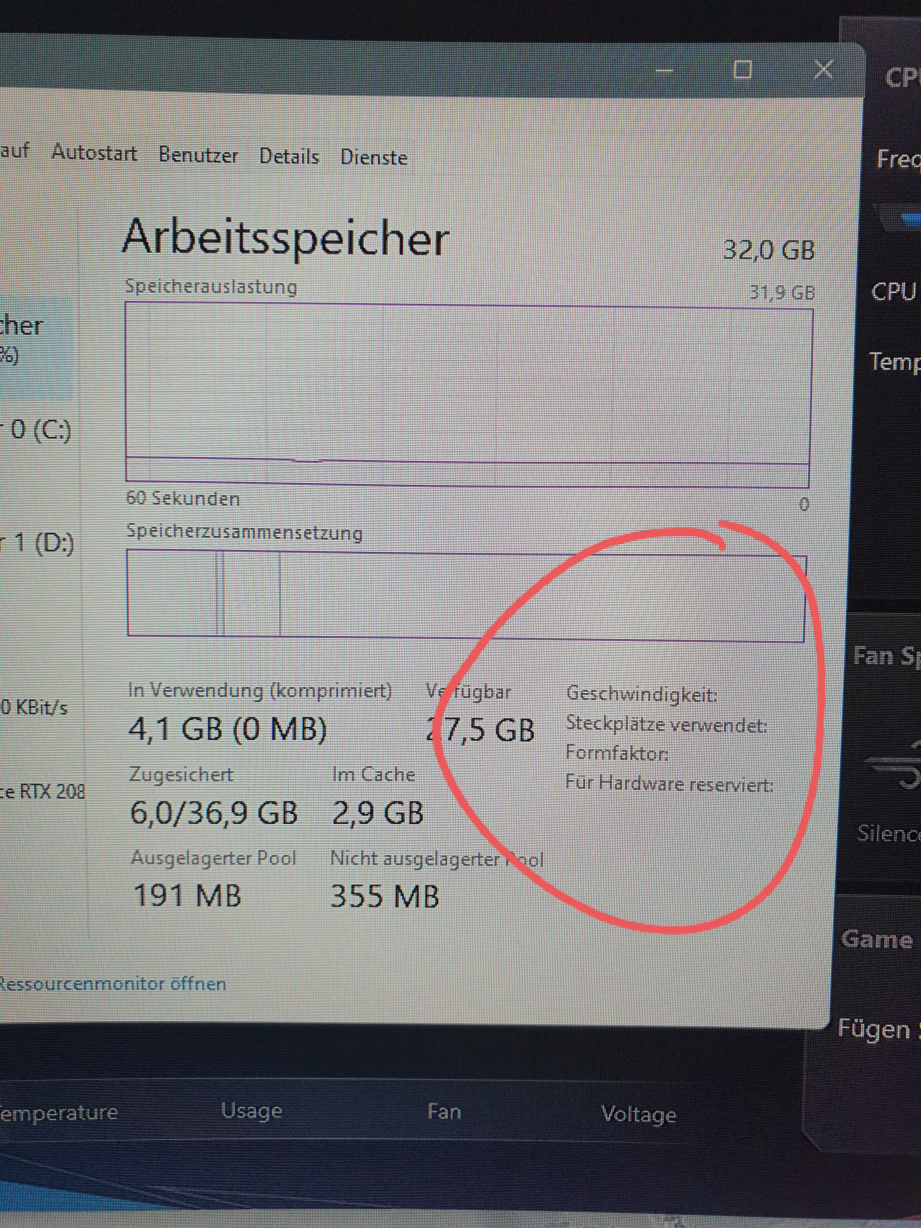 Im Task-Manager, wird seit ich meinen Ram von 2x8Gb auf 4x8 Gb erweiterte die Geschwindigkeit nicht mehr angezeigt. (Bild)