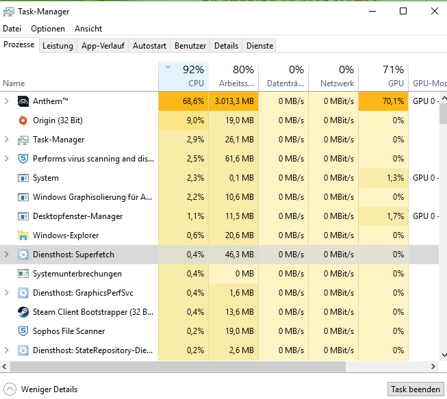 Ich habe mir als das spiel Anthem am 22.2.19 rauskam es direkt gekauft. Die demo habe ich auch gespielt bei der ich noch garkeine Probleme hatte. Wenn ich spiele braucht das Spiel in etwa 3-4GB RAM von 8 GB aber es wird fast immer eine auslastung von 90-100% angezeigt. Meine CPU wird zu 60-70% ausgelastet aber es wird auch ein Wert von 100% angezeigt und die GPU ist manchmal auch deutlich höher als das Spiel verbraucht. Meistens habe ich garnichts im Hintergrund geöffnet, nur manchmal Teamspeak aber trotzdem muss ich mit lags spielen, manchmal sogar lange Standbilder. Hier mal ein Screenshot vom Taskmanager