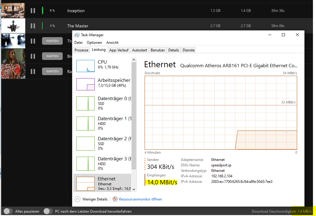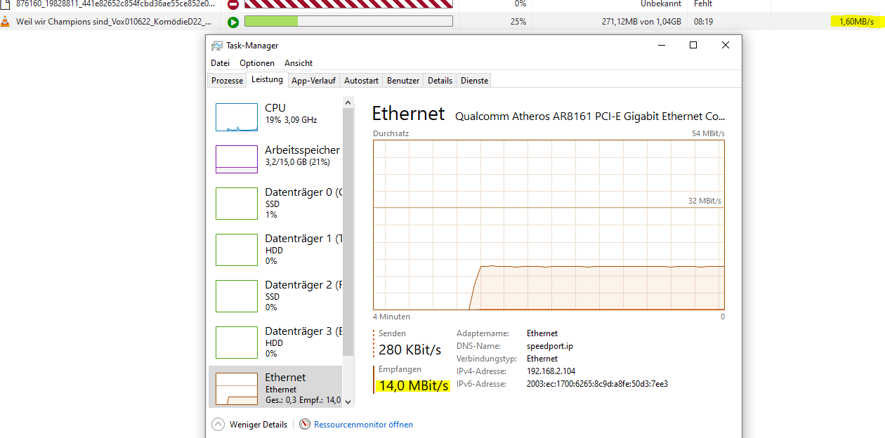 ich bin von 100Mbit auf 250Mbit gewechselt. Meine Fritzbox zeigt mir im Download 292Mbit an. Beim Herunterladen über verschiedene Quellen habe ich im Taskmanger stets 280Mbit im Download angezeigt. Beim Download von Dateien schwankt der Download aber währenddessen im Downloadmanager immer schnell zwischen 28,29,30 MB/s hin und her. Laut Bandbreitenrechner müsste ich aber mit 280Mbit 35MB/s schaffen...