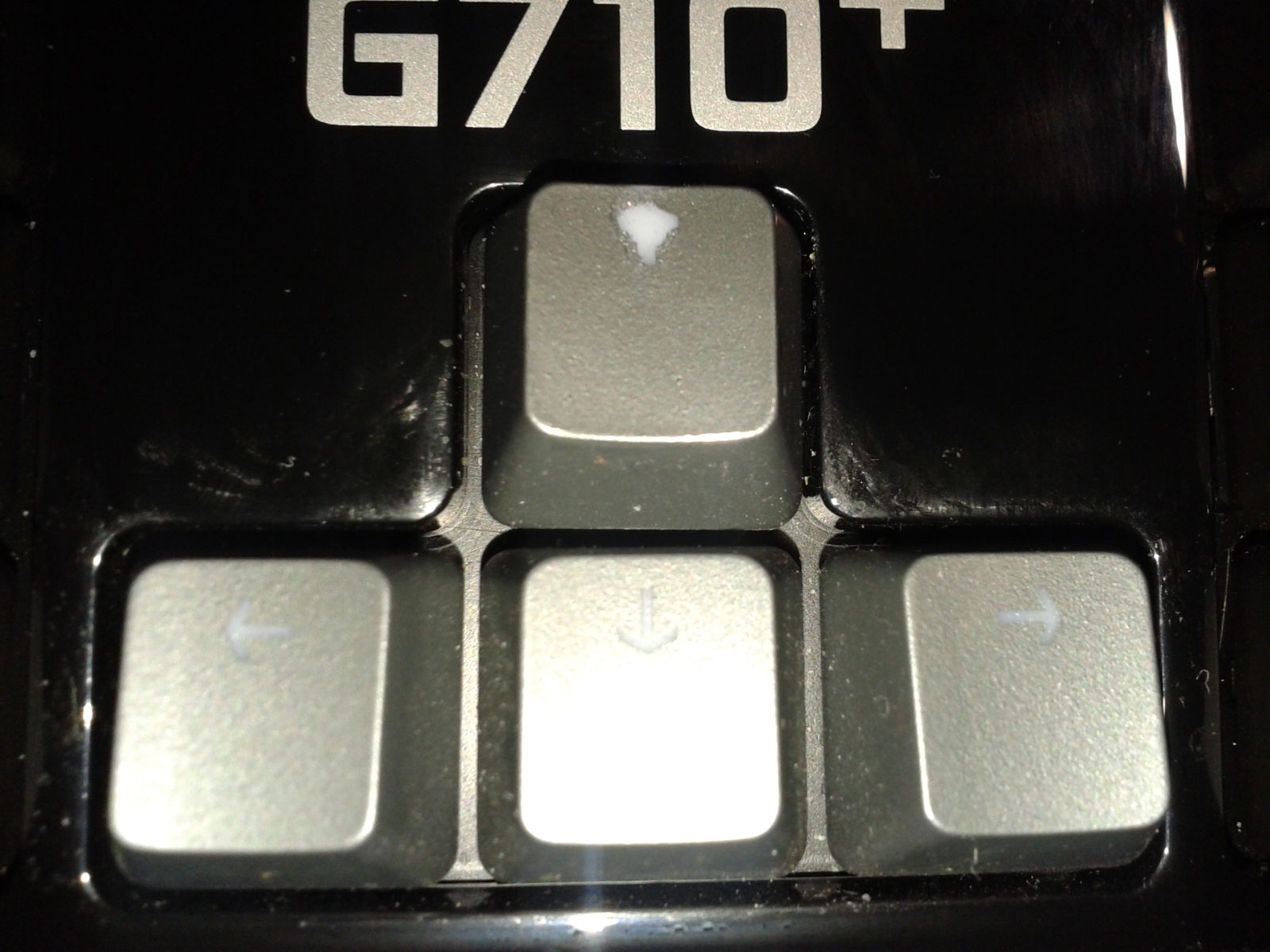 Dann kam im Juni 2013 eine LogitechG710+ dazu und die nutze ich bis heute. Aber selbst da zeigen sich bereits extreme Verschleißerscheinungen bei den Pfeiltasten. Wie Ihr unschön auf dem Foto erkennen könnt sieht der Pfeil Aufwärts eher wie eine Keule denn ein Pfeil aus. Eine schriftl. Anfrage bei Logitech-Support brachte bis heute keine Antwort.