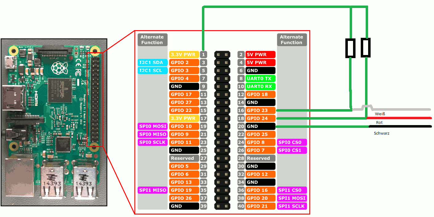 Ich weiß, dass ich irgendwo noch einen 4,7kOhm Widerstand anlöten muss aber vielleicht kann mir von Euch ja jemand in Gänze erklären, wie ich was zusammenlöte um dann entsprechend die Rückmeldung am Raspi auszulesen.