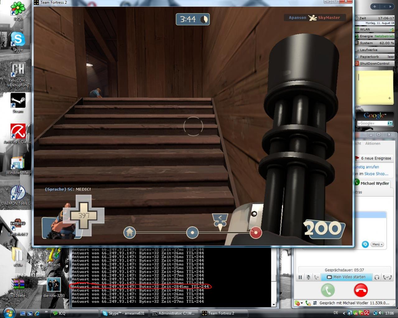 Seit ich von Win xp auf win vista umgestiegen bin, hat mein team fortress 2 angefangen zu laggen... ich hab es schon in einem anderen Forum probiert, aber leider ohne erfolg. Die neusten Grafiktreiber sind installiert, ich hab steam und Tf2 schon 3 mal deinstalliert und neu drauf gemacht und die "NSVCAPPFLT.EXE", die ich hier in einem andern Thread die Lösung eines ähnlichn problem war exestiert bei mir nicht. hier ist noch ein screenshot mit einer Ping-anfrage an Google("ping www.google.de -t"), die ich hab laufen lassen wärend ich TF2 gezockt hab... Das Rot eingekreiste ist passier als TF geruckelt hat.