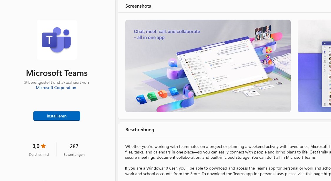 Interessanterweise scheint dieses Teams standardmäßig mit Win 11 mitzukommen. Bzw. nach der Installation automatisch heruntergeladen zu werden, siehe Bild 2.