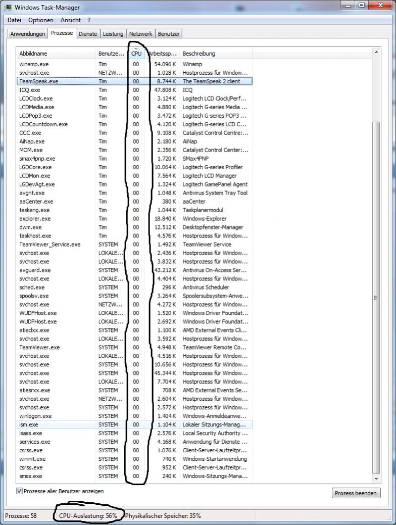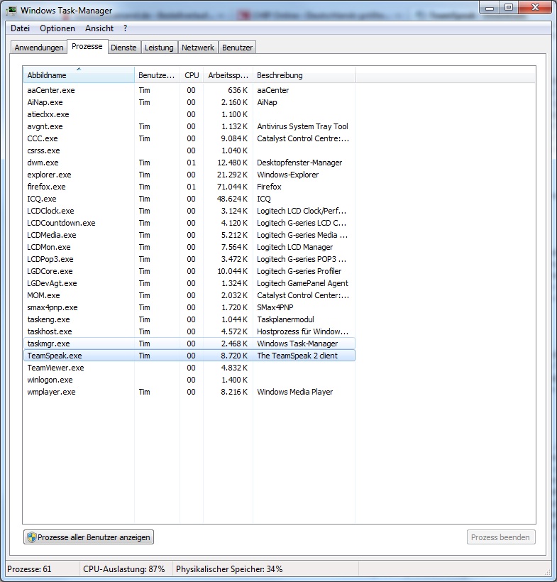 Ich habe seit gestern das ich, wenn ich teamspeak starte egal ob ich online bin oder einfach nur TS geöffnet ist, eine CPU Auslastung von Konstant 50% habe.