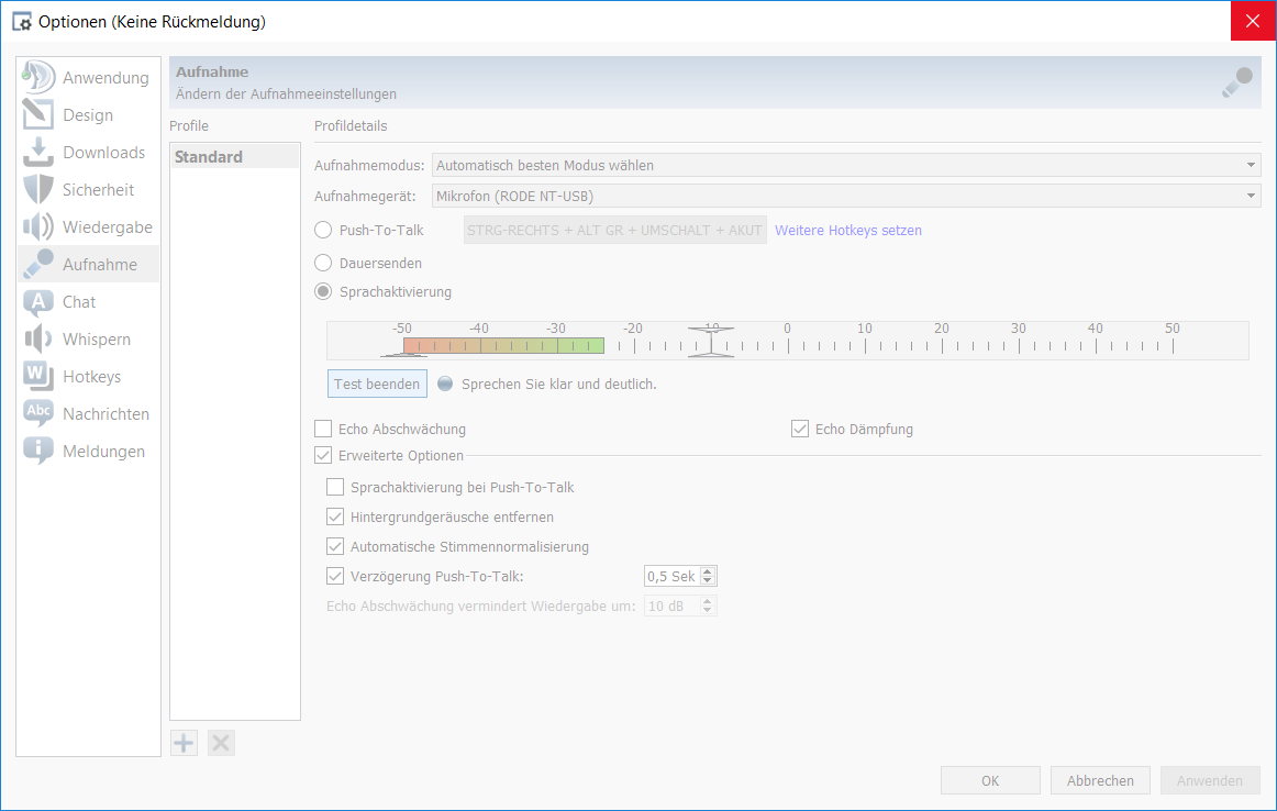 hallo. warum auch immer stürzt ts seit gestern ab, wenn ich bei Einstellungen -> Aufnahme auf Test starten drücke. TS friert dann nach so 2 Sek. ein und dann kommt keine Rückmeldung . ist das problem bekannt ?? habe version 3.0.19.4