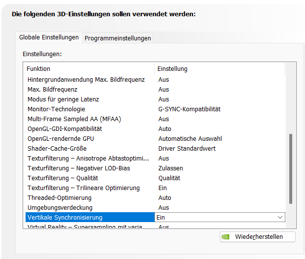 Dann habe ich im Treiber (oder auch nur im Spiel) die Framrate auf 120 Hz limitiert und jetzt habe ich kein Tearing aber halt nur 120 Hz. Die 120 Hz sind butterweich ohne Tearing oder Ruckler.